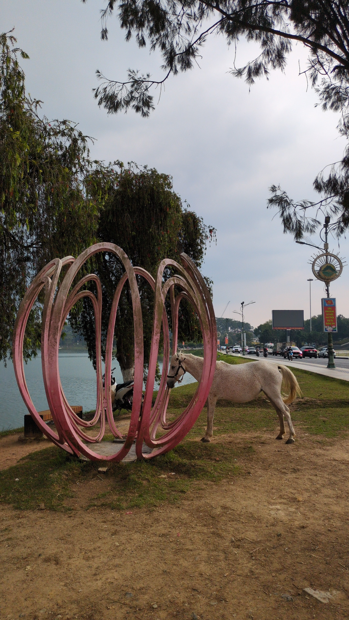 An outdoor scene features a white horse sculpture in front of a lake. The horse is positioned to the right of a large, pink, abstract spiral structure. In the background is a road with vehicular traff…read more