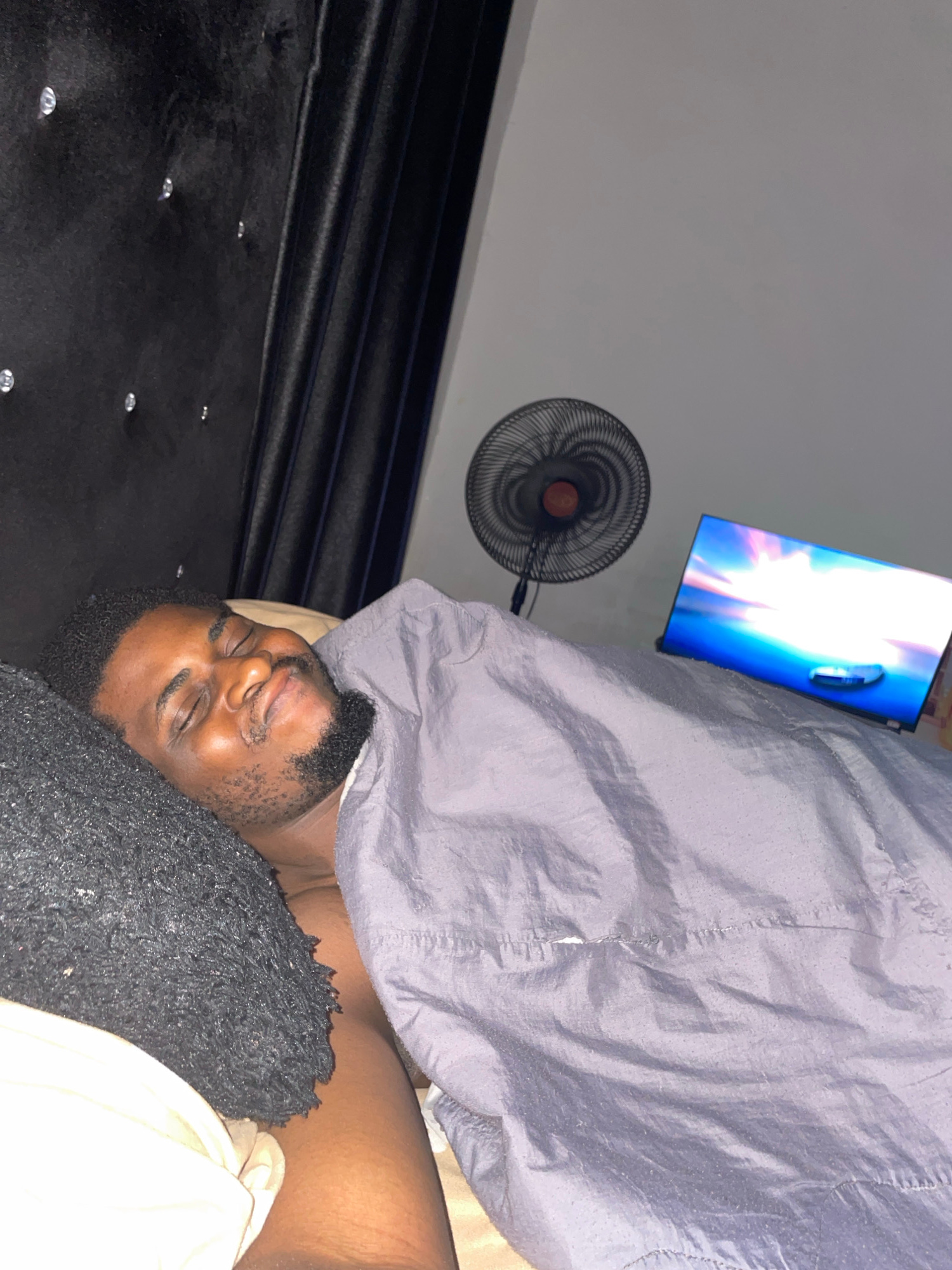 A man is lying in a bed. He has dark hair, a beard, and is covered by a gray blanket and a black pillow. The setting is indoors, potentially a bedroom, with a black headboard visible. A fan is mounted…read more