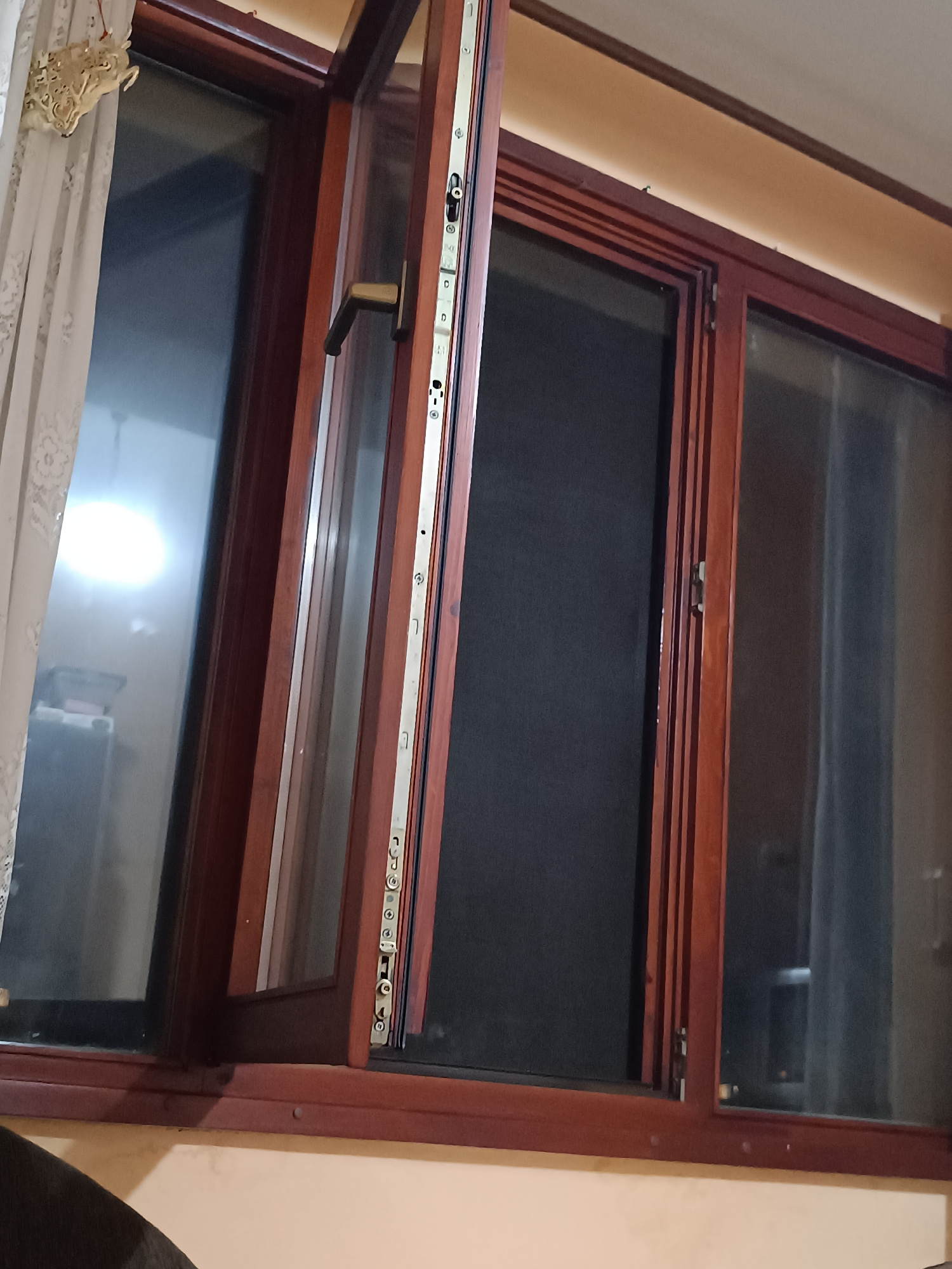 The image shows a partially open, multi-pane window with a dark wood frame. The window is hinged on the right and swings inward. One pane of the window has a dark screen, while the others are glazed.…read more