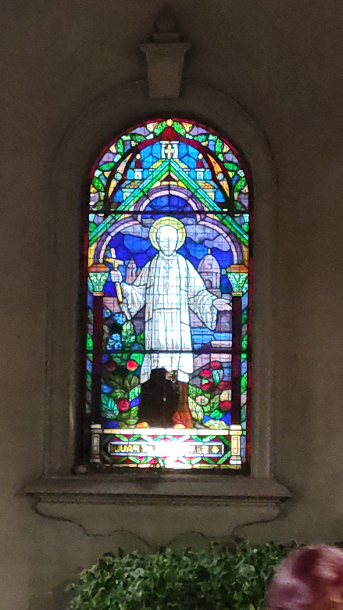 A stained-glass window is centered in the frame. The window is set within a light-gray, arched alcove, with architectural moldings. The stained glass depicts a figure wearing a white robe, with a halo…read more