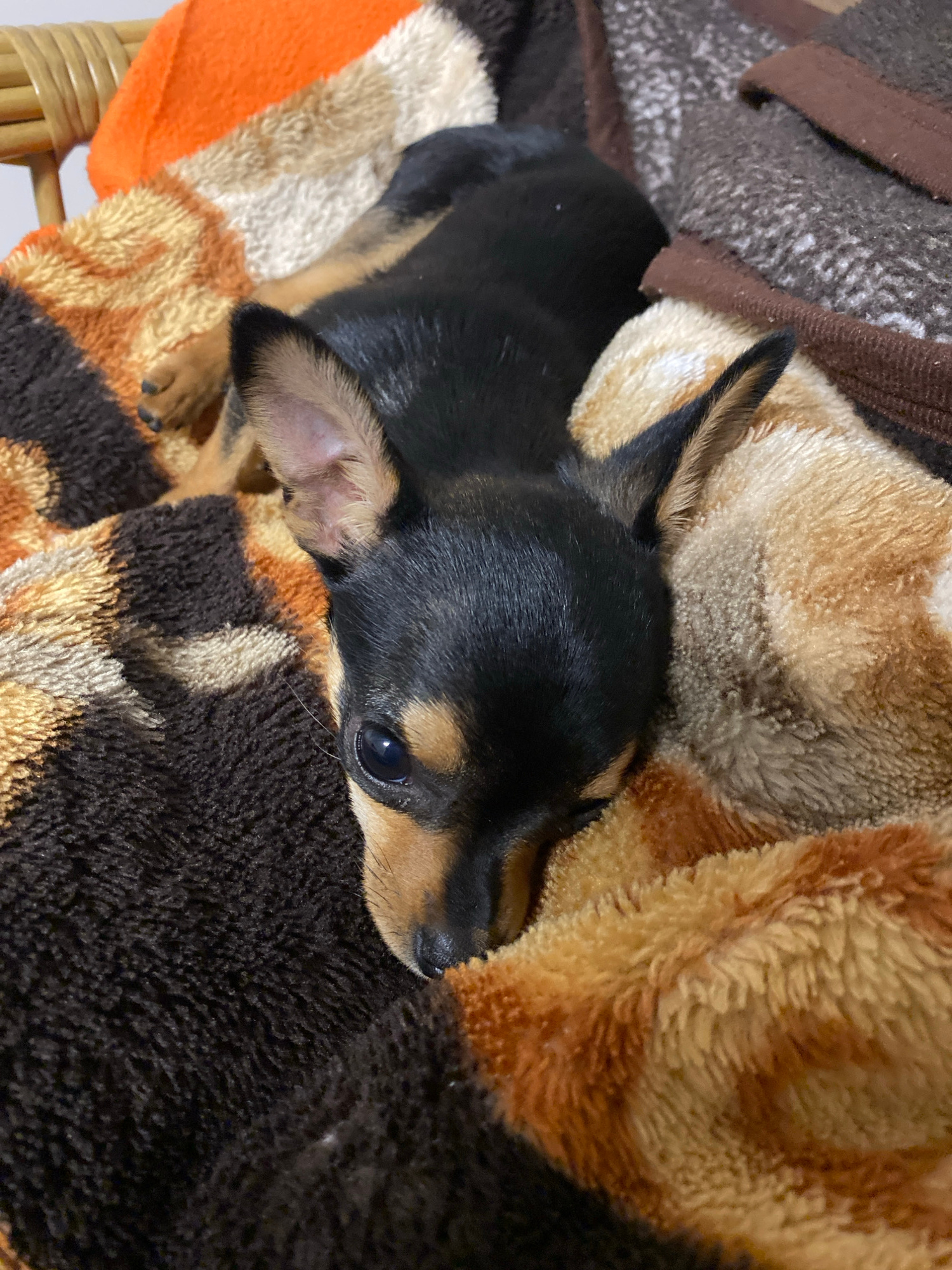 A small, black and tan Chihuahua-like dog is lying on a patterned blanket. The dog has a sleek black coat with tan markings on its face, chest, and legs. It is lying down with its head resting on the…read more
