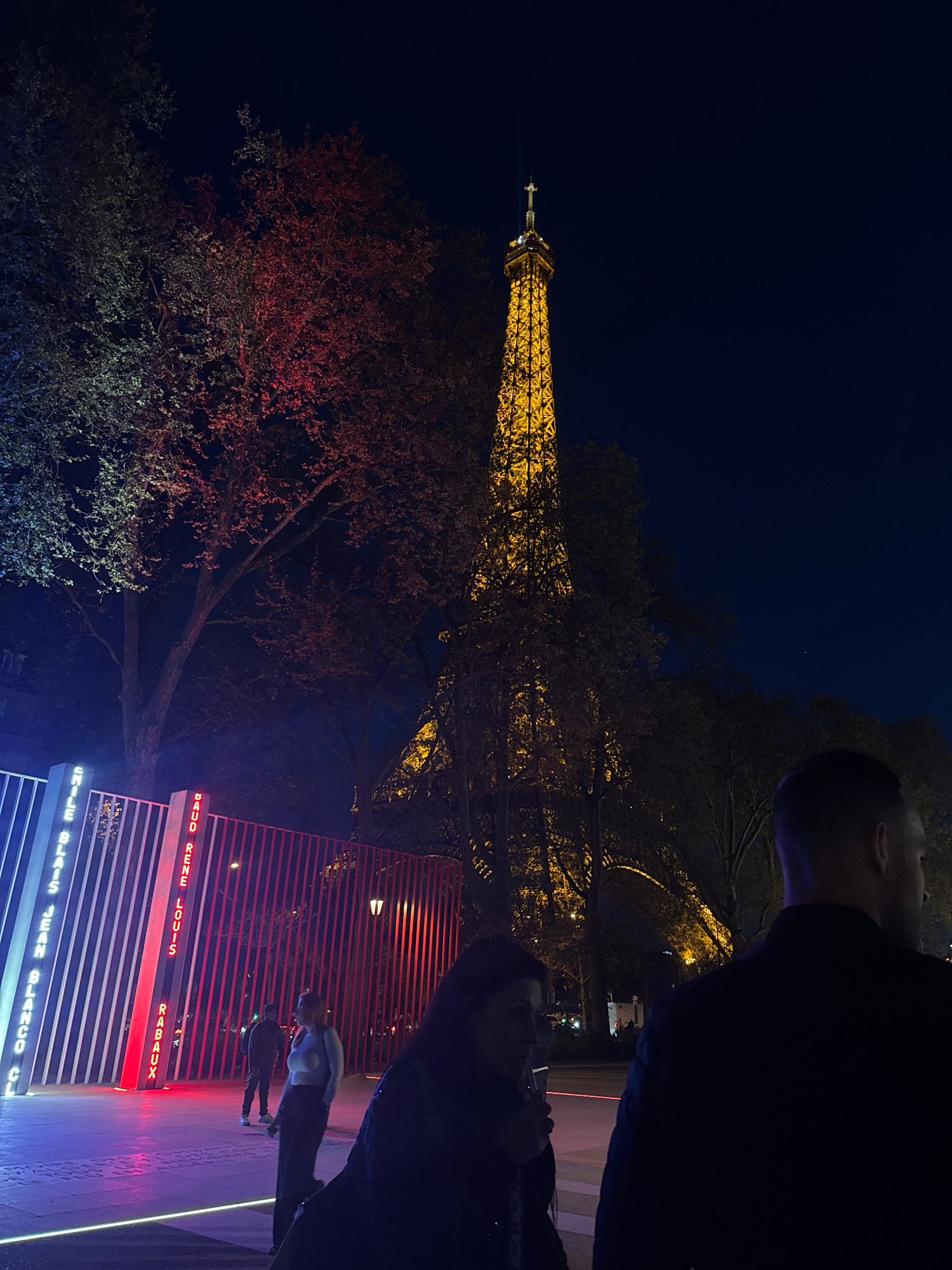 At night in Paris, the illuminated Eiffel Tower is visible against the dark sky. A tree with red-lit leaves is in the foreground to the left of the tower. A building with neon signs is to the right of…read more
