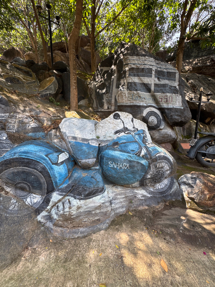 A rock sculpture depicts a blue and white motorcycle with the word "SAHARA" written on one of the blue parts. Above it, another rock sculpture has a tire and a black and white painting of what appears…read more