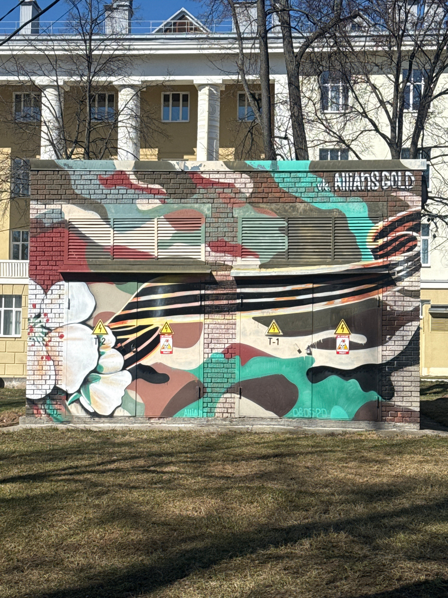 An eye-level outdoor shot shows a utility box painted with a graffiti-style mural in Votkinsk, Russia. The mural incorporates camouflage colors like brown, green, tan, and black, along with stripes, flowers, and yellow "Danger" signs with a lightning bolt symbol and text. The phrase "ALWAYS GOLD" is also painted on the box. To the right of the box, a dry grass field extends. To the left, a multi-story building with white columns and beige walls can be seen. Bare trees frame the building and the blue sky is visible above. | Open Wire