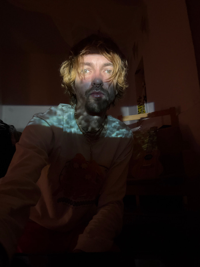 A low-lit indoor shot features a person with light brown hair and a beard. The person wears a light-colored, long-sleeved shirt and a necklace. A pattern of light illuminates part of their face and cl…read more