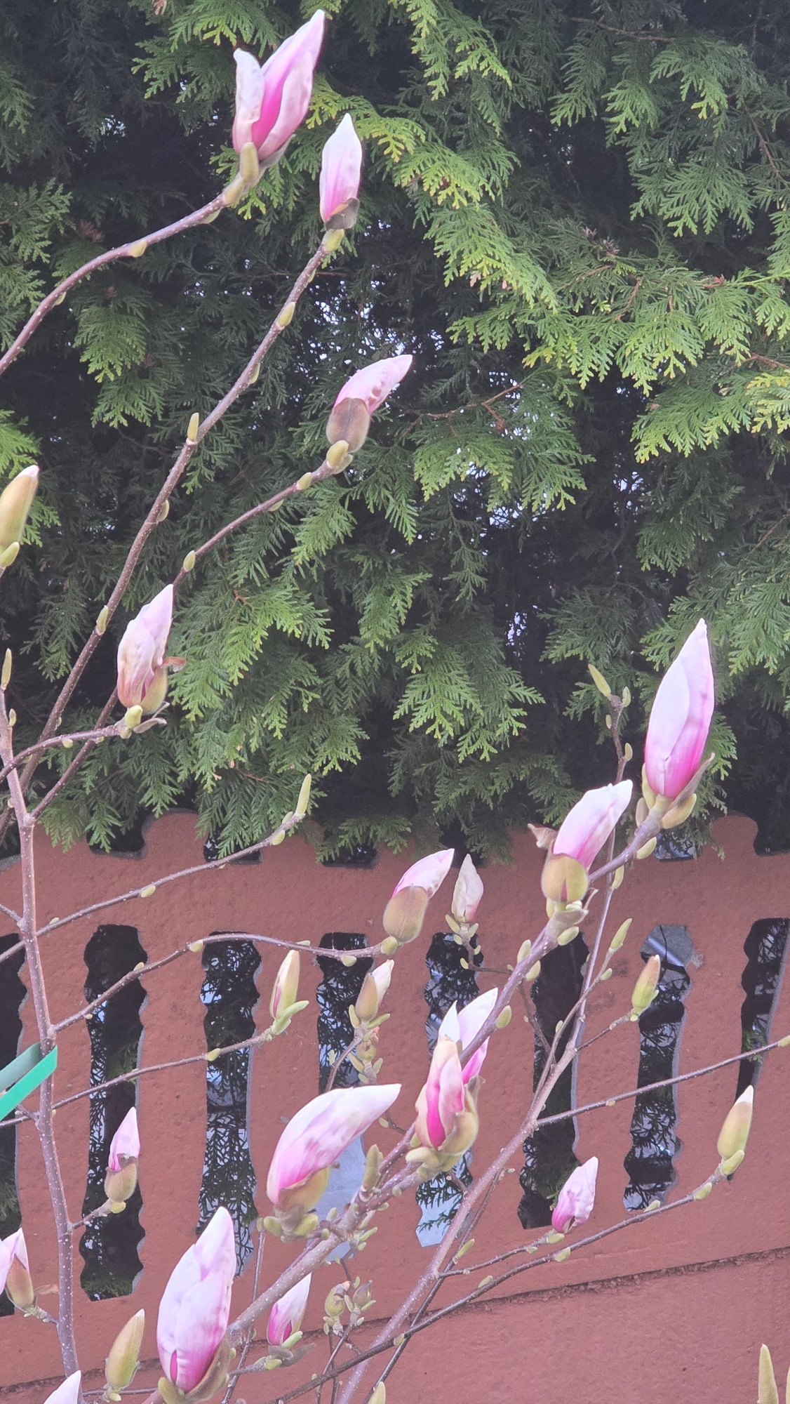The image captures an outdoor scene featuring branches of a magnolia tree adorned with numerous pink flower buds. These branches, thin and bare of leaves, extend across the frame, showcasing buds in v…read more