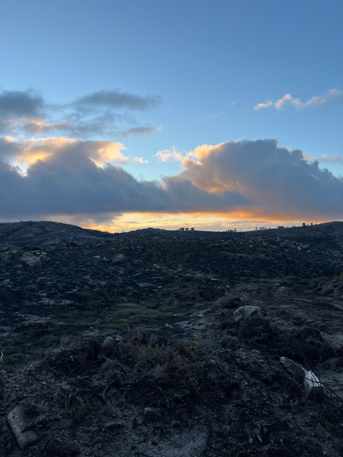 A landscape image shows a dark, craggy rock face on the right, contrasting with a blue sky filled with clouds on the left. The clouds are illuminated with golden hues, suggesting a sunrise or sunset.…read more