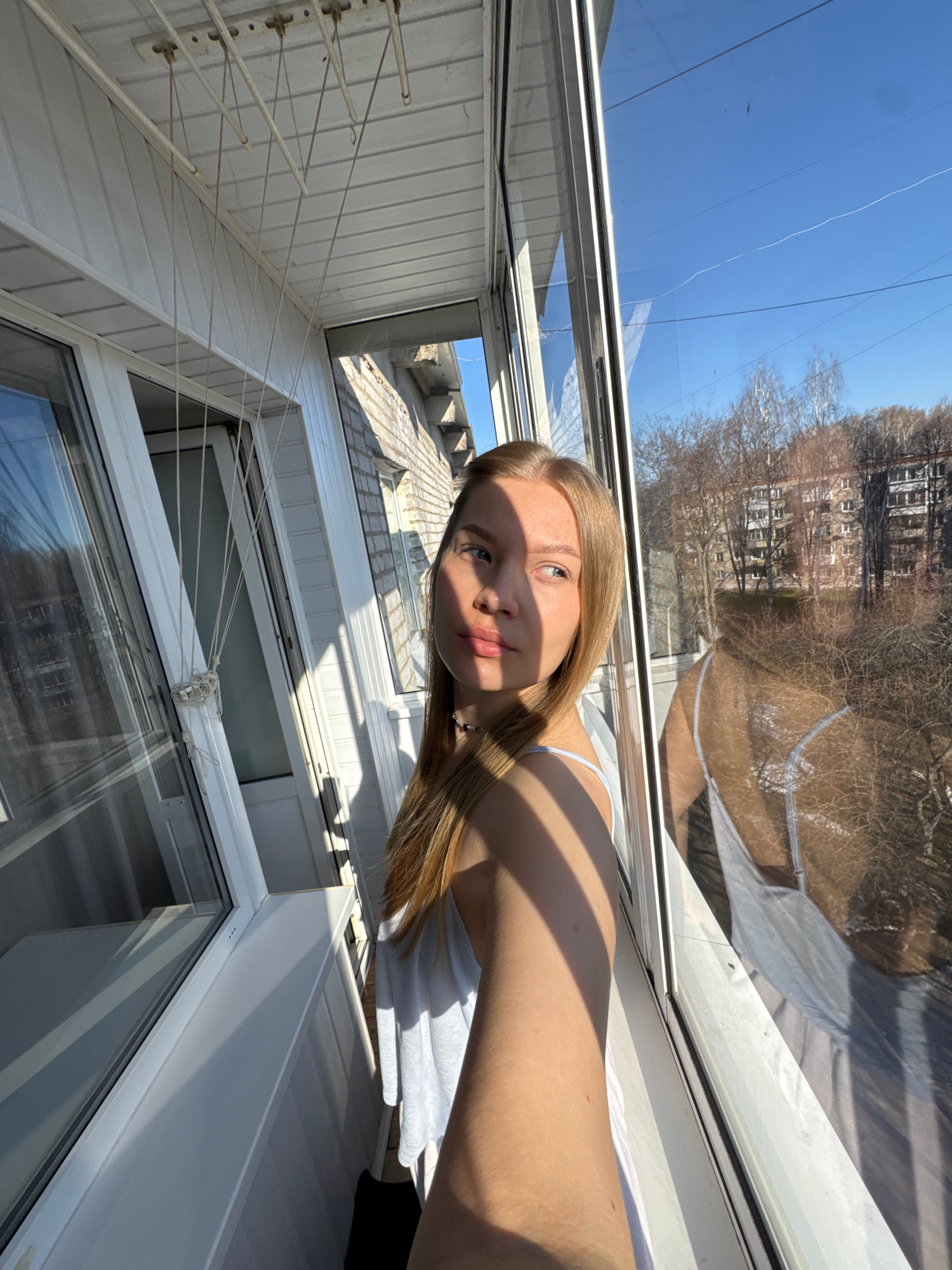 The image captures a brightly lit, top-down selfie of a young woman within an enclosed balcony or sunroom. The woman, with long, straight blonde hair and a fair complexion, looks calmly towards the ca…read more