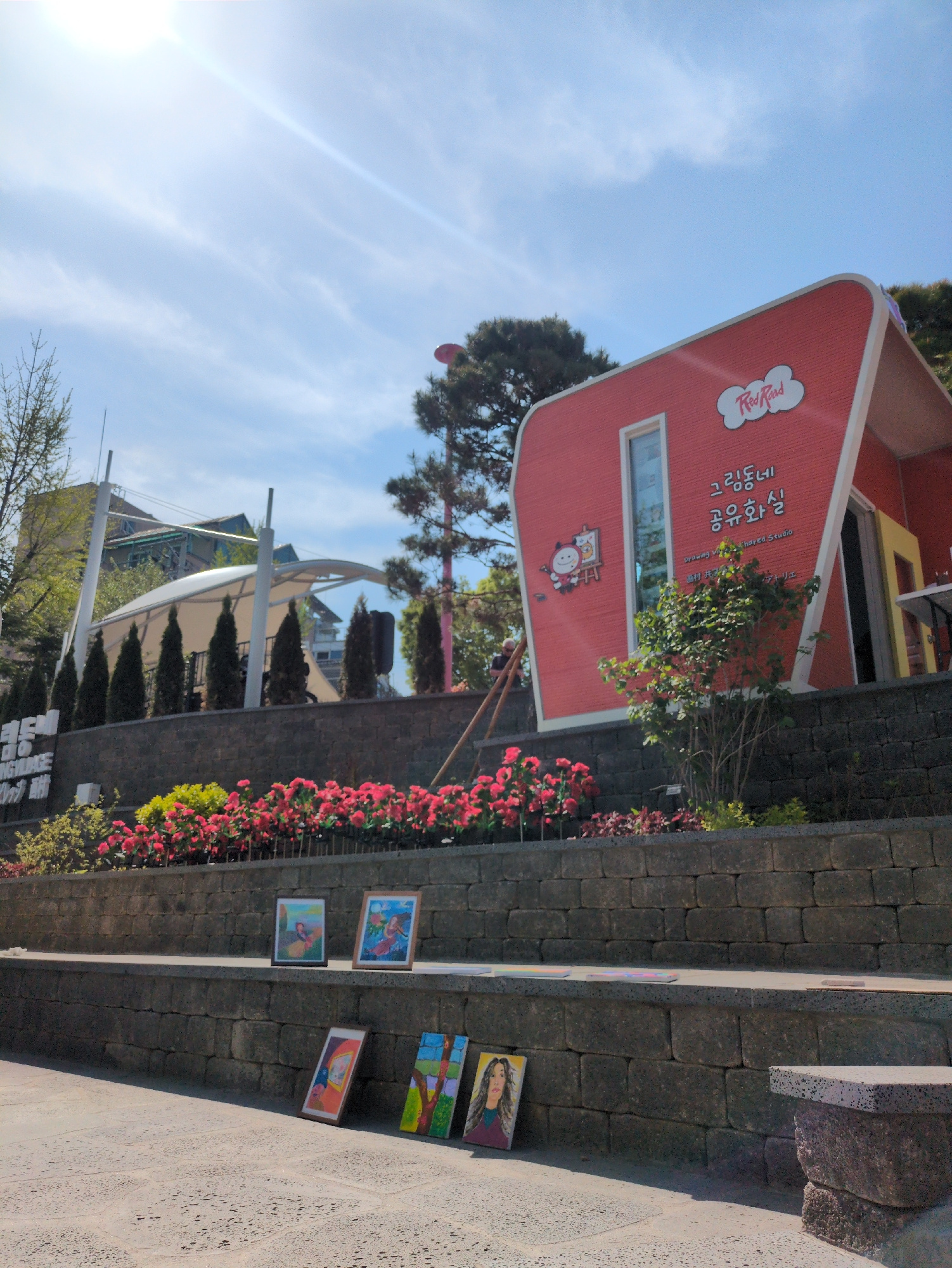 The image shows an outdoor scene, likely a public space, in Seoul, South Korea. A red building with Korean writing and a "Red Road" logo is prominently featured. The building has a window and a small…read more
