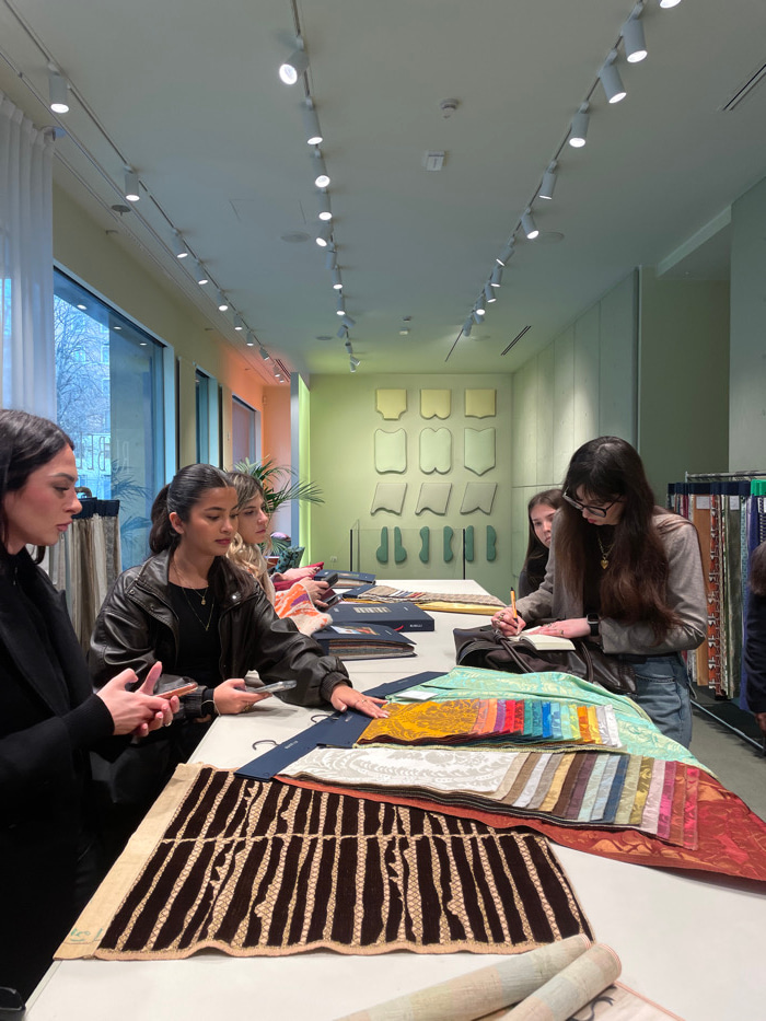 The image depicts an interior scene within a modern textile showroom, specifically identified as the Rubelli showroom located at Via Fatebenefratelli, 9 in Milan, Italy. The space is brightly lit by w…read more