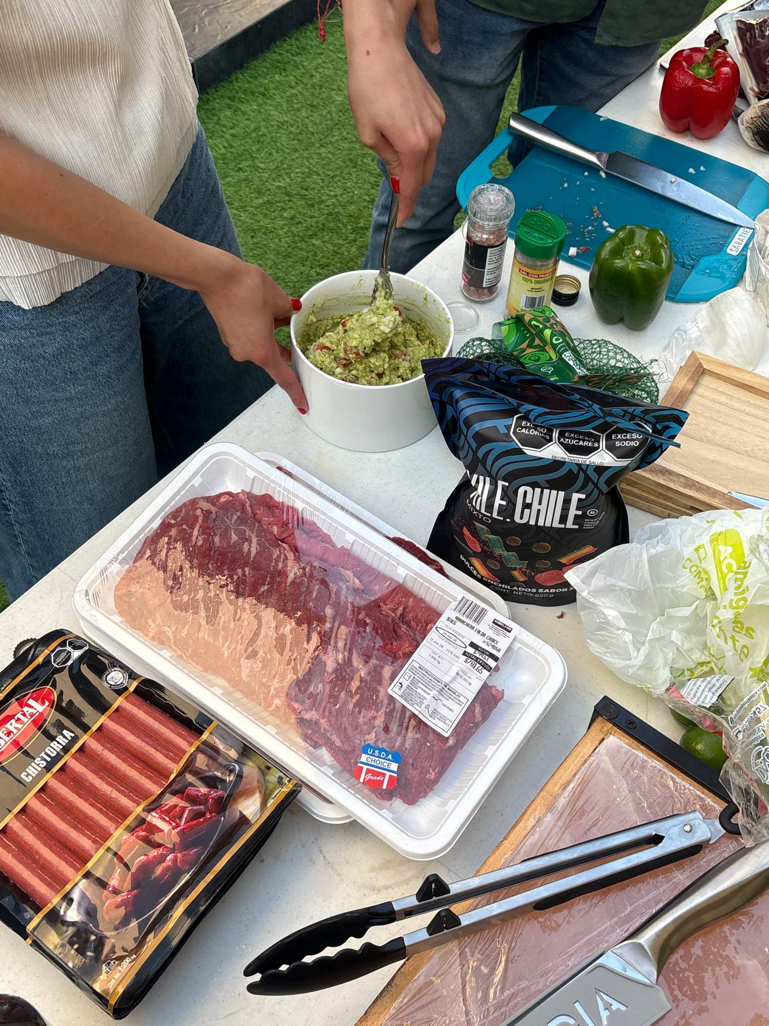 This overhead shot captures a tabletop scene of meal preparation, likely for a barbecue or gathering, in San Bernardino Tlaxcalancingo, Mexico. Two individuals are partially visible: one person, weari…read more