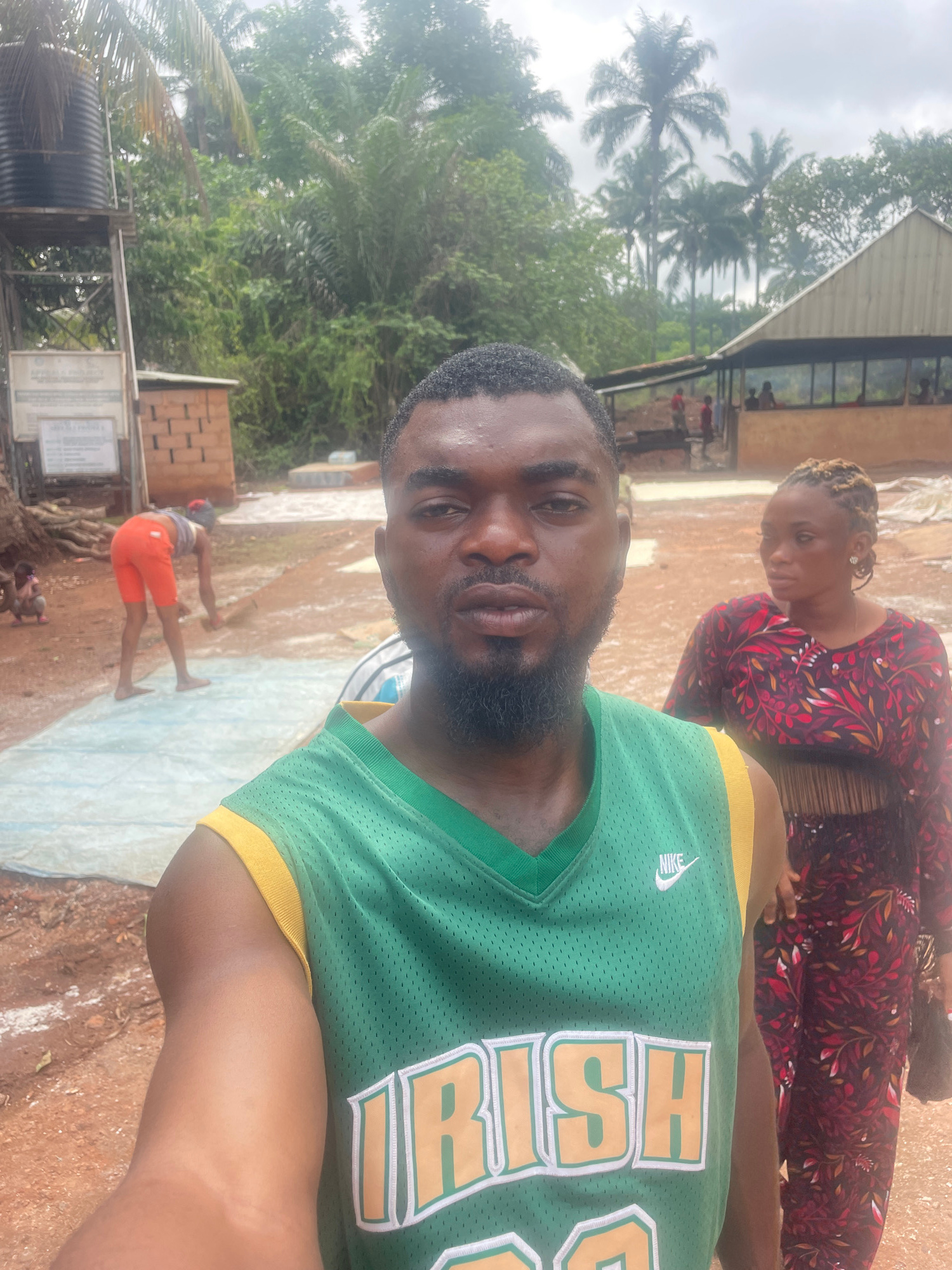 The image shows a man in a green and yellow "IRISH" jersey taking a selfie with a woman in a red patterned shirt in the background. The background indicates a rural or semi-rural setting with trees, a…read more