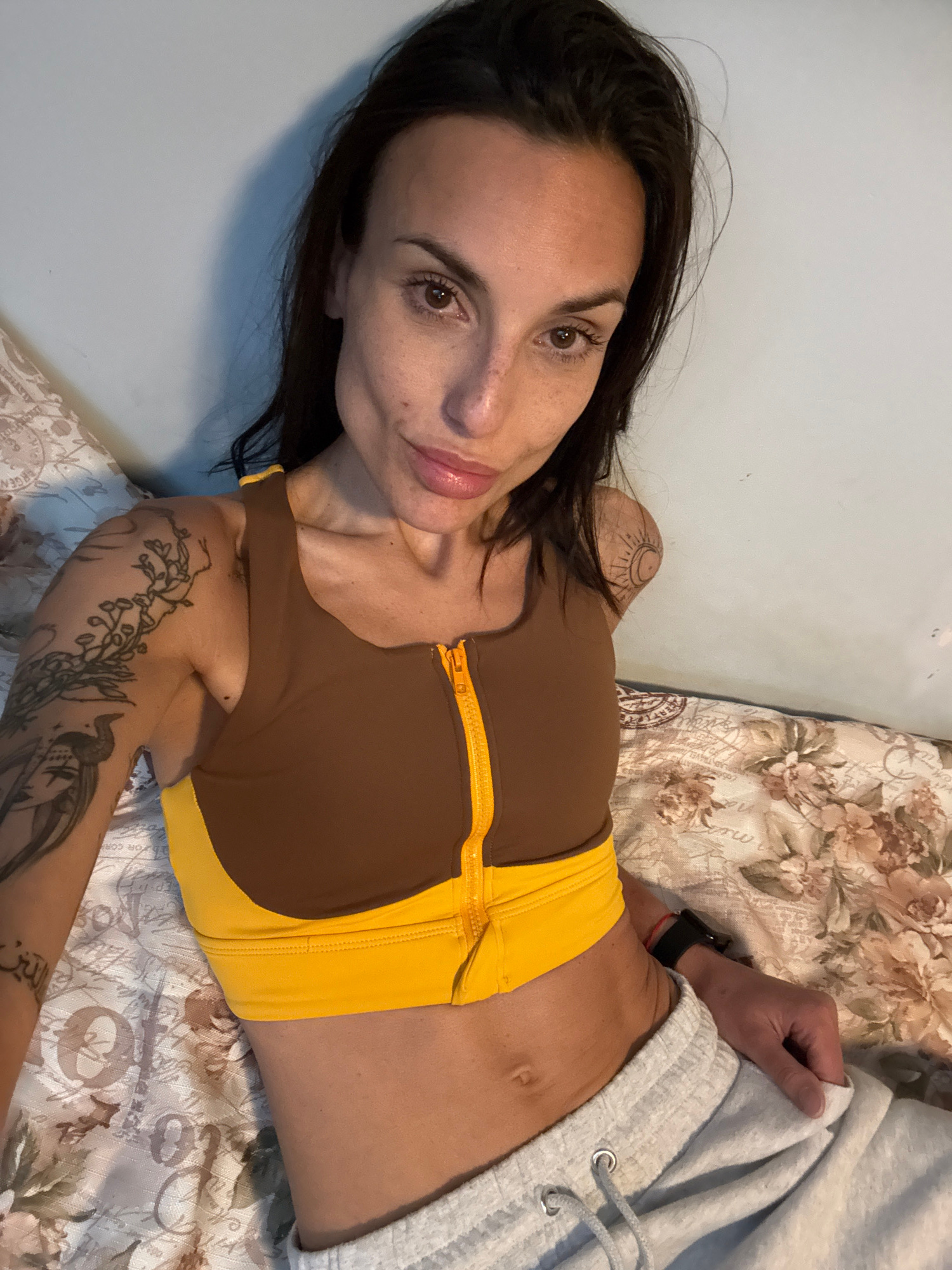 The image depicts a woman lying on a bed with a floral patterned bedspread. She is wearing a brown and yellow sports bra with a zipper in the front and light gray sweatpants. She has dark hair and lig…read more