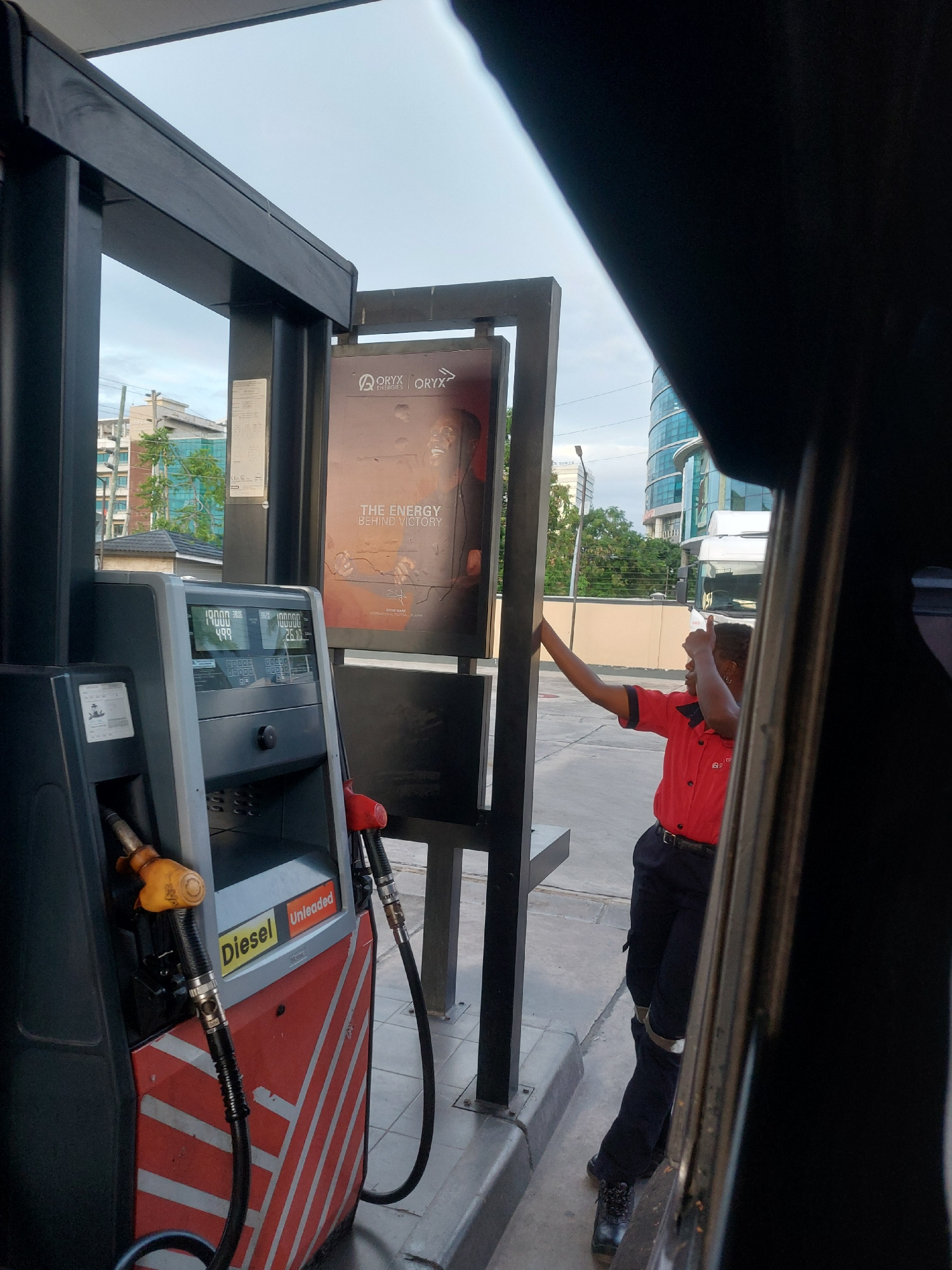 A gas station attendant, wearing a red uniform shirt and black pants, leans against a black metal frame holding an advertisement sign at an Oryx gas station. The sign reads "Oryx Energies: The Energy…read more