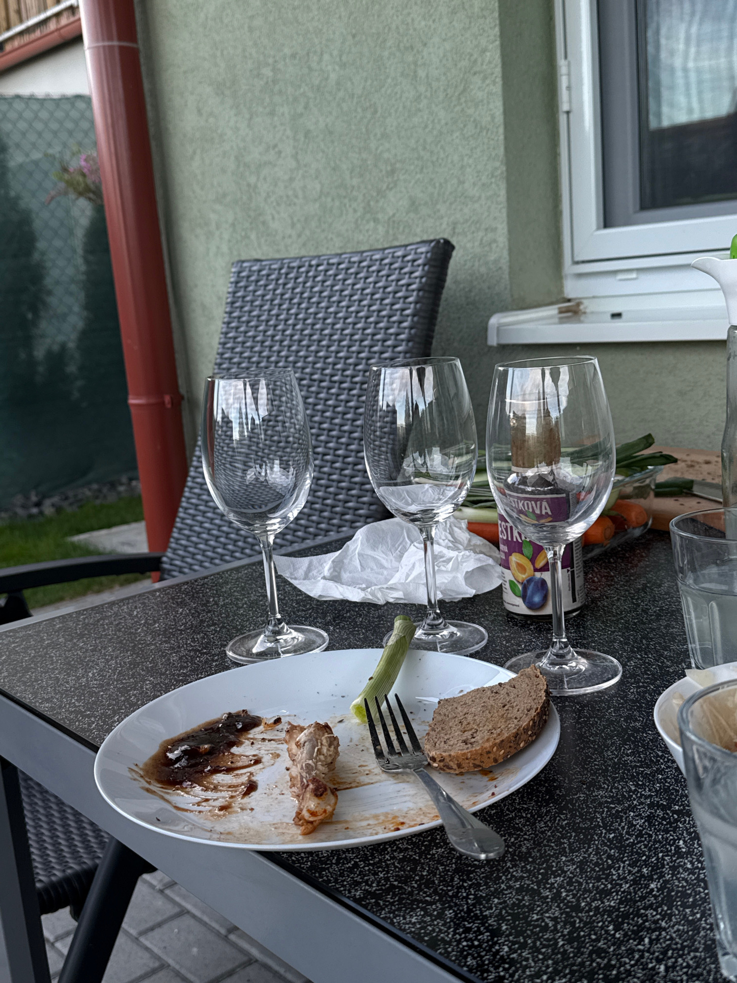 The image shows an outdoor dining scene, likely after a meal. Three empty wine glasses are on the table, along with a half-eaten piece of bread, remnants of a meal including meat and sauce on a whiteβ¦read more