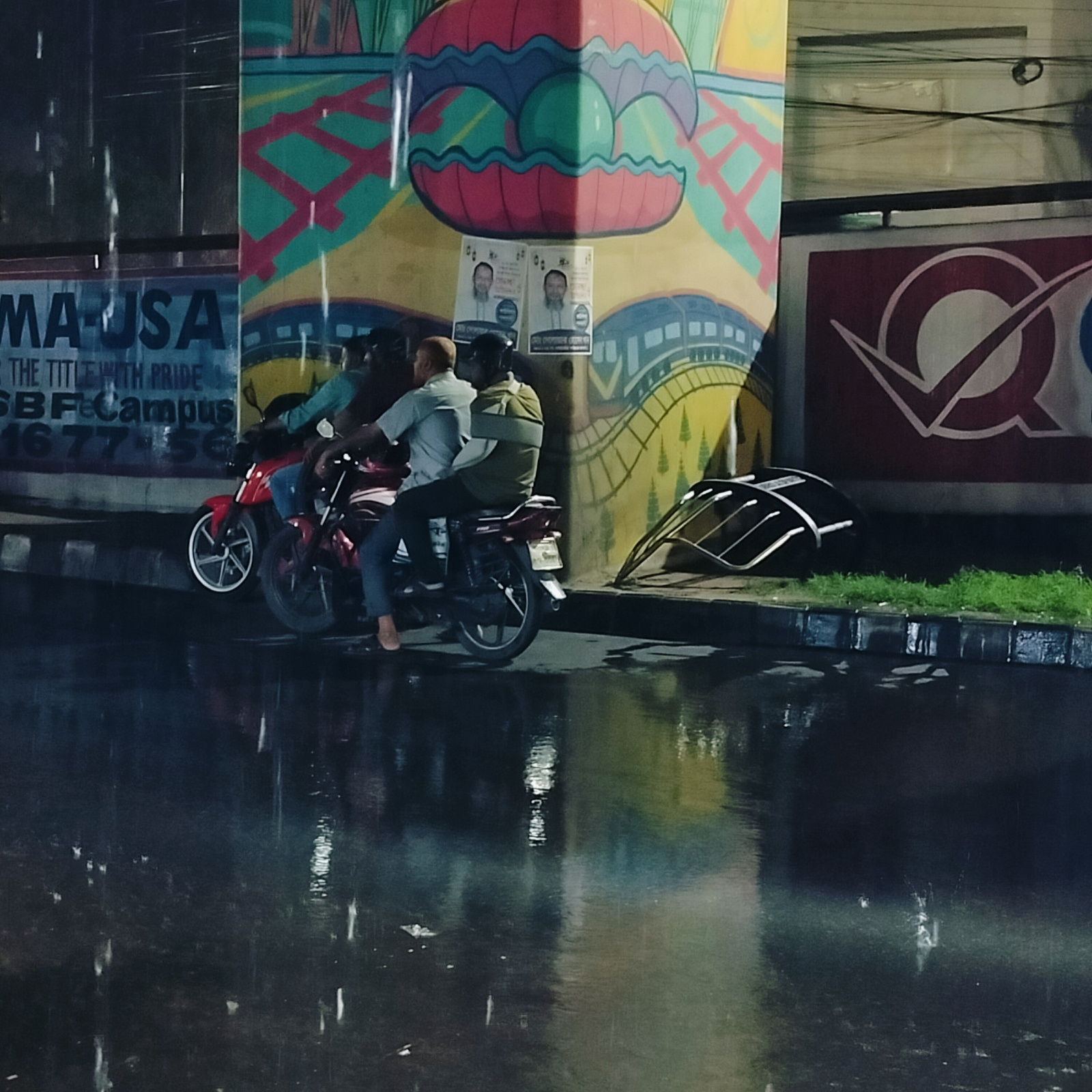 The image captures a rainy street scene in Dhaka, Bangladesh, at night. Two motorcycles are parked near a pillar adorned with colorful graffiti and posters. The motorcycles are occupied by three men,…read more
