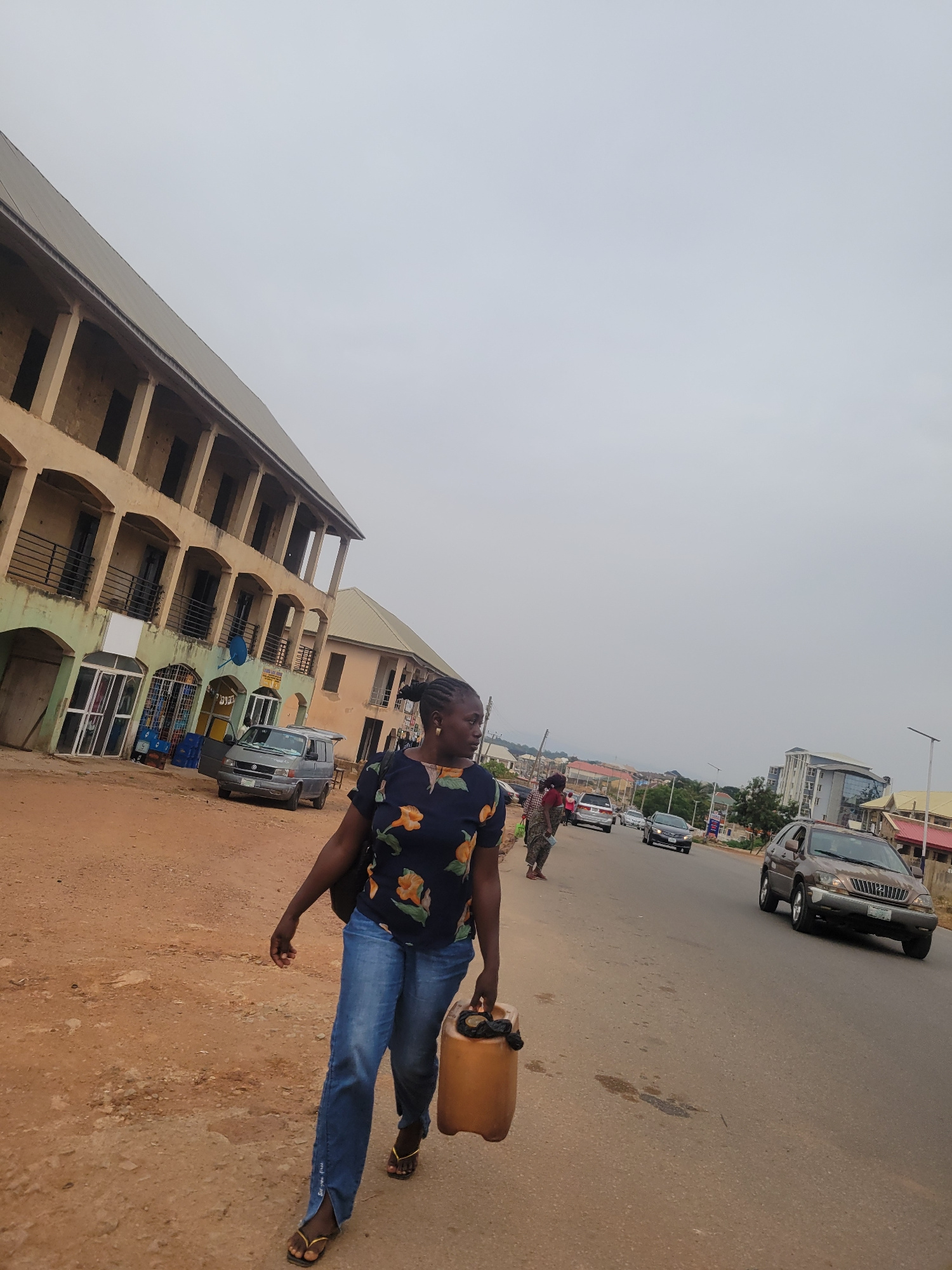 The image, rotated counter-clockwise, captures a daytime street scene in Jos, Nigeria, under an overcast sky. In the foreground, a young person, possibly female, with braided hair, walks along a dustyβ¦read more