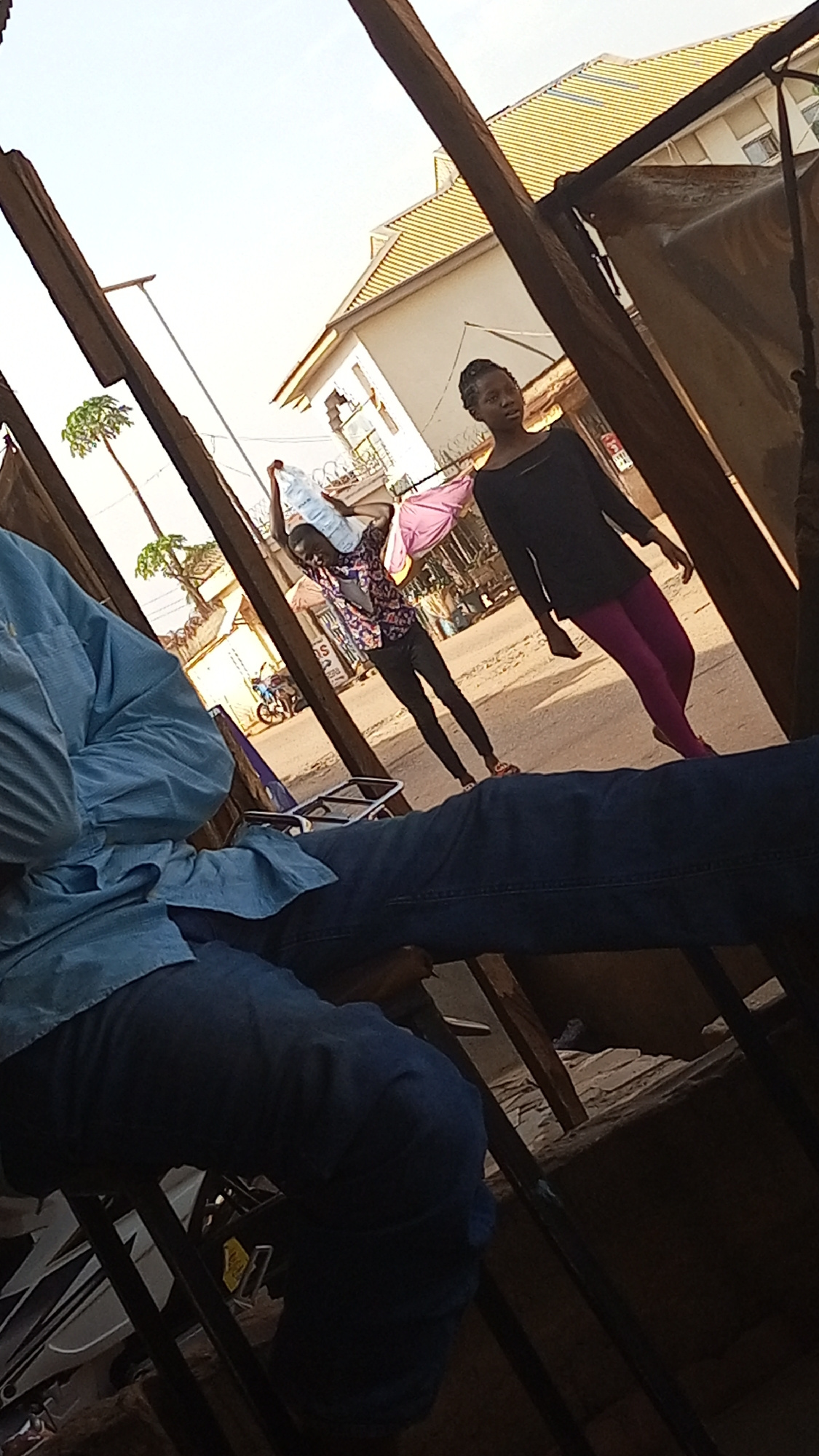 The image, taken in what appears to be Sabon Tasha, Nigeria, shows a street scene viewed from an elevated, enclosed position. A person wearing a light blue shirt and blue jeans is partially visible inβ¦read more