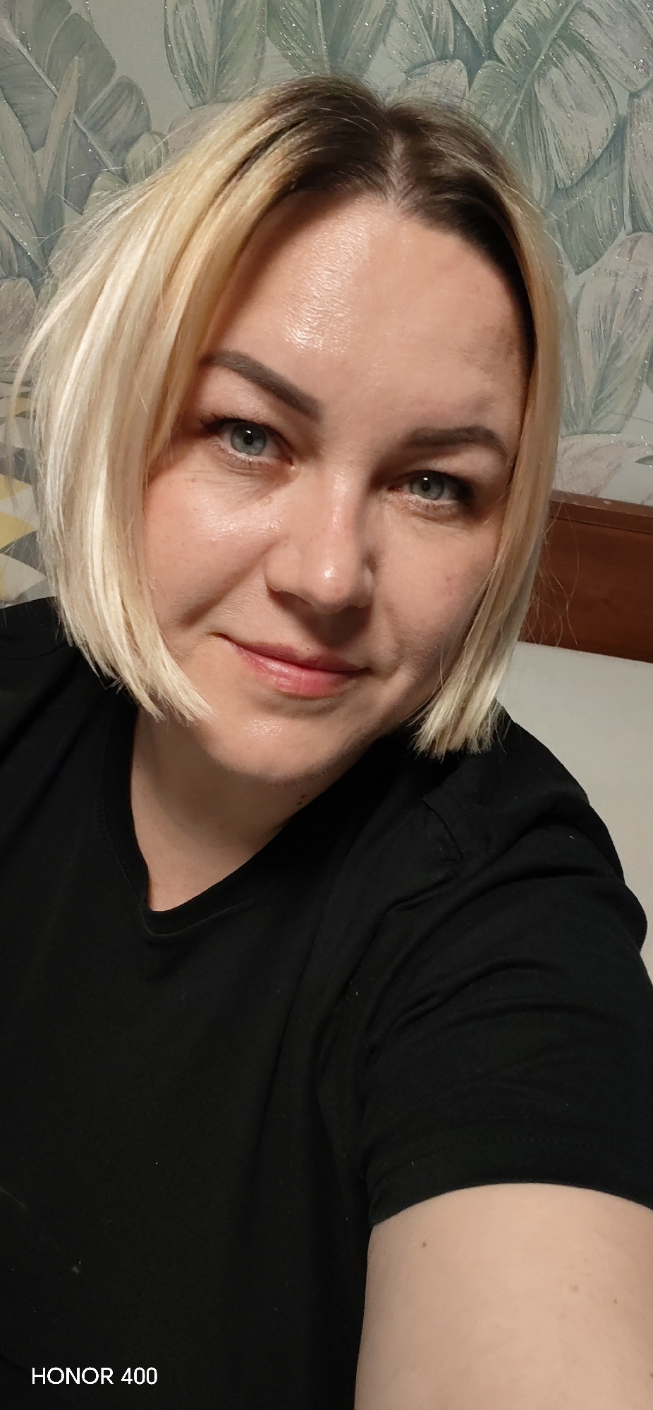 A close-up portrait of a woman with short, blonde hair. She is wearing a black t-shirt. Her eyes are blue. The background consists of a wall with a leaf pattern. The text "HONOR 400" is visible in theβ¦read more