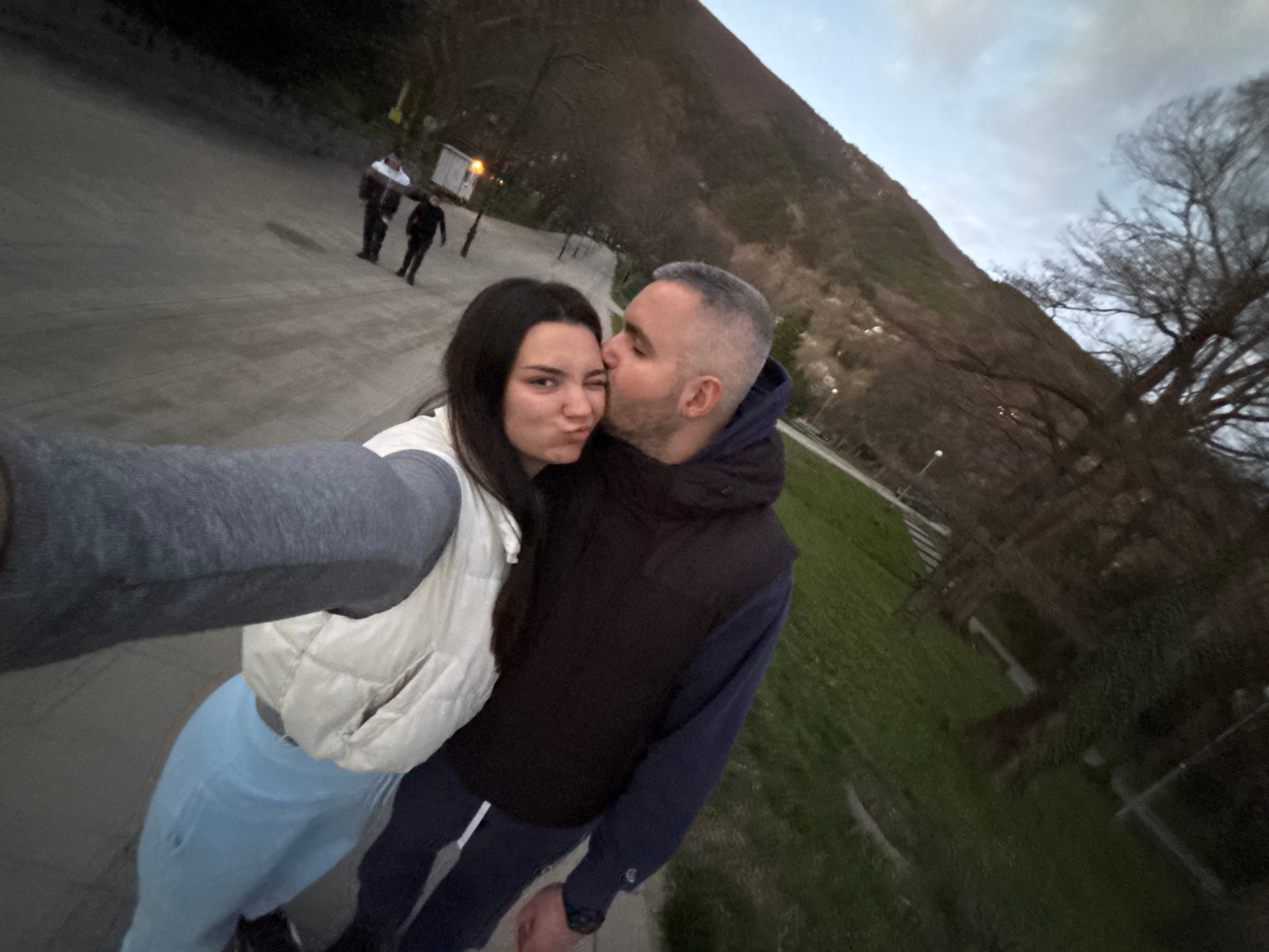 A selfie of a man and a woman in an outdoor setting. The man is older, with short grey hair, wearing a dark jacket over a blue hoodie. He is kissing the woman on the cheek. The woman has long dark hai…read more