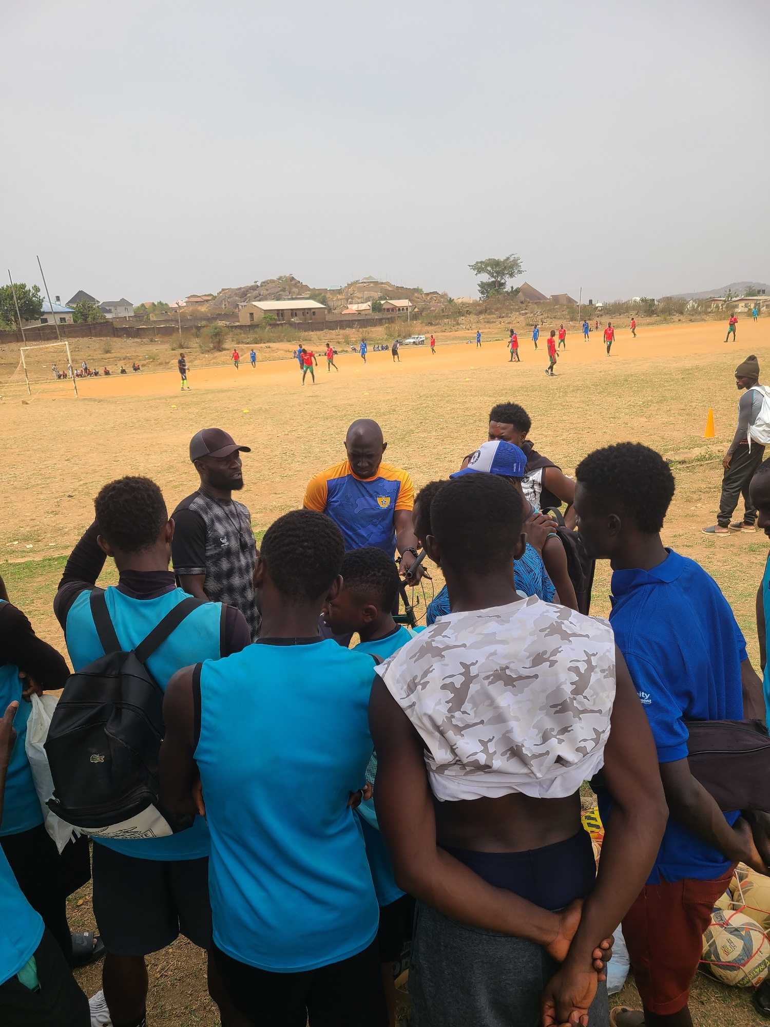 The image shows a group of people in an open field, likely in Barikin Jirga Summa, Nigeria. They are standing in a huddle, possibly observing a soccer game in progress on the field. Some individuals a…read more