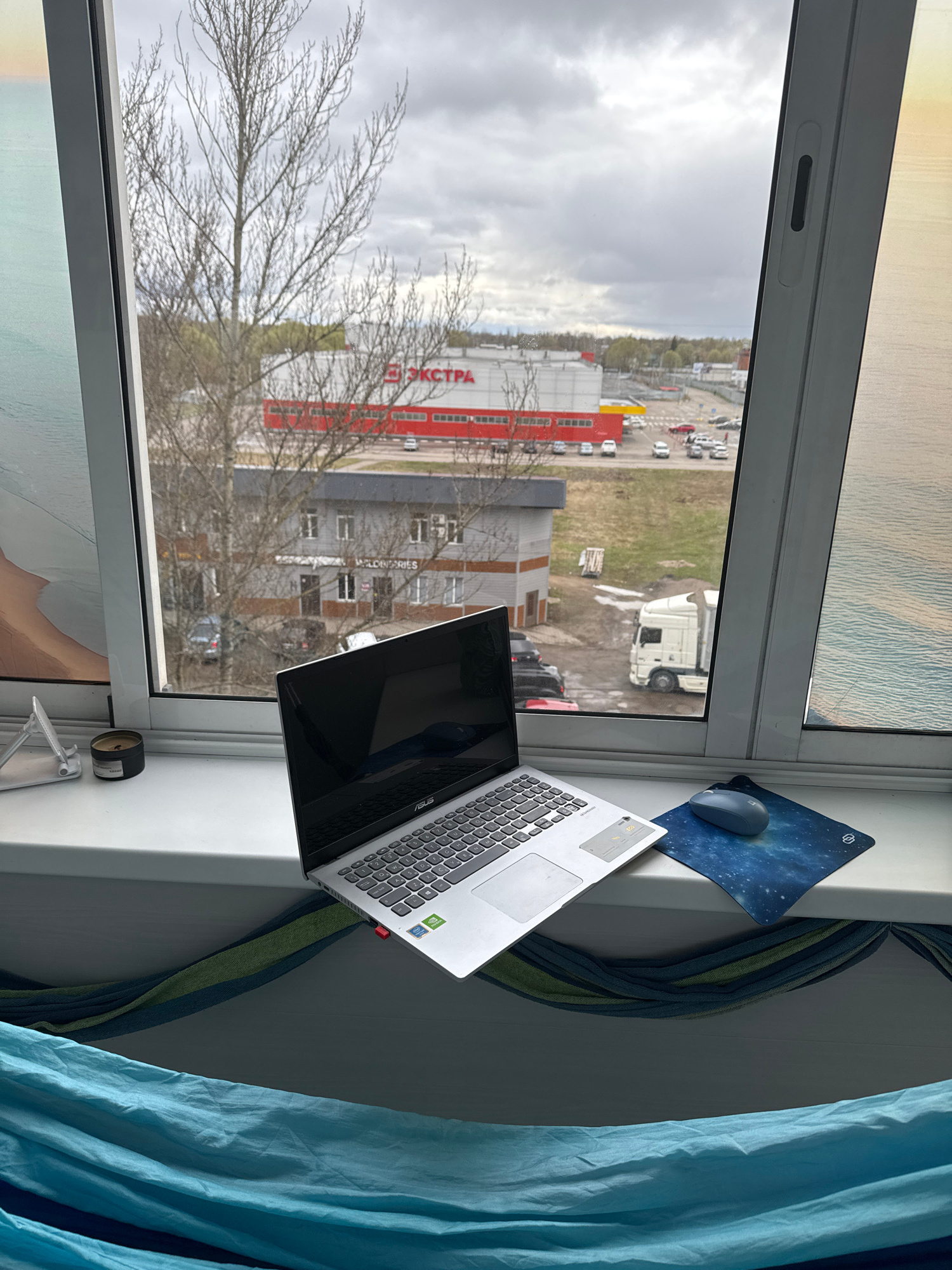 The image, when viewed upright, displays an indoor setting looking out a window onto an urban/suburban landscape. On a white window sill to the right, a silver ASUS laptop is open, showing "NVIDIA GeF…read more