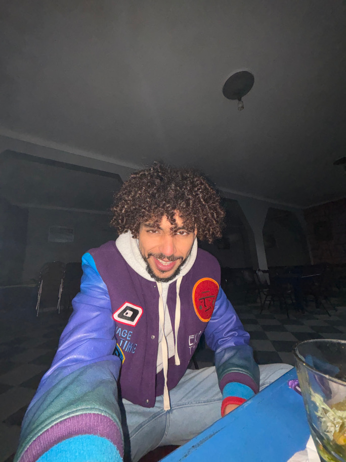 A man with curly hair grins, wearing a purple and blue letterman-style jacket over a white hooded sweatshirt and light-wash jeans. Part of a blue table is visible, with a bucket on top. The background…read more
