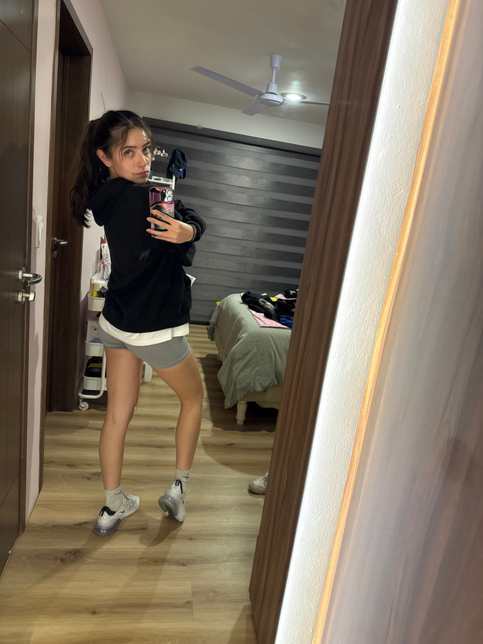 A woman stands in a doorway, holding a phone up for a mirror selfie. She wears a black sweatshirt, gray shorts, socks, and gray sneakers. A bed with a green comforter is visible behind her, along with…read more