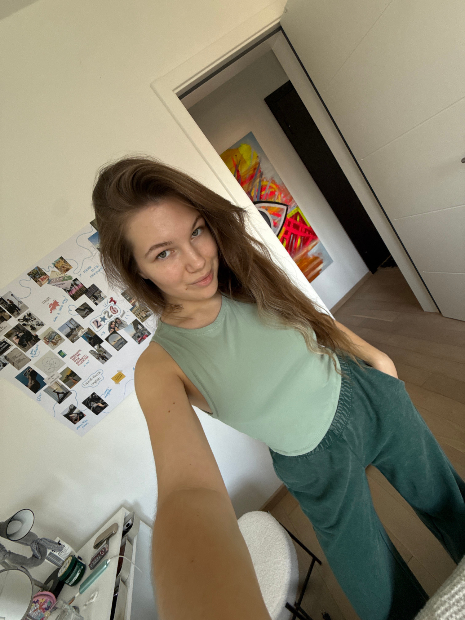A woman is taking a selfie in what appears to be a room in a residence. She is wearing a light green top and darker green pants. A collage of photos and text is on the wall to her left. The collage in…read more