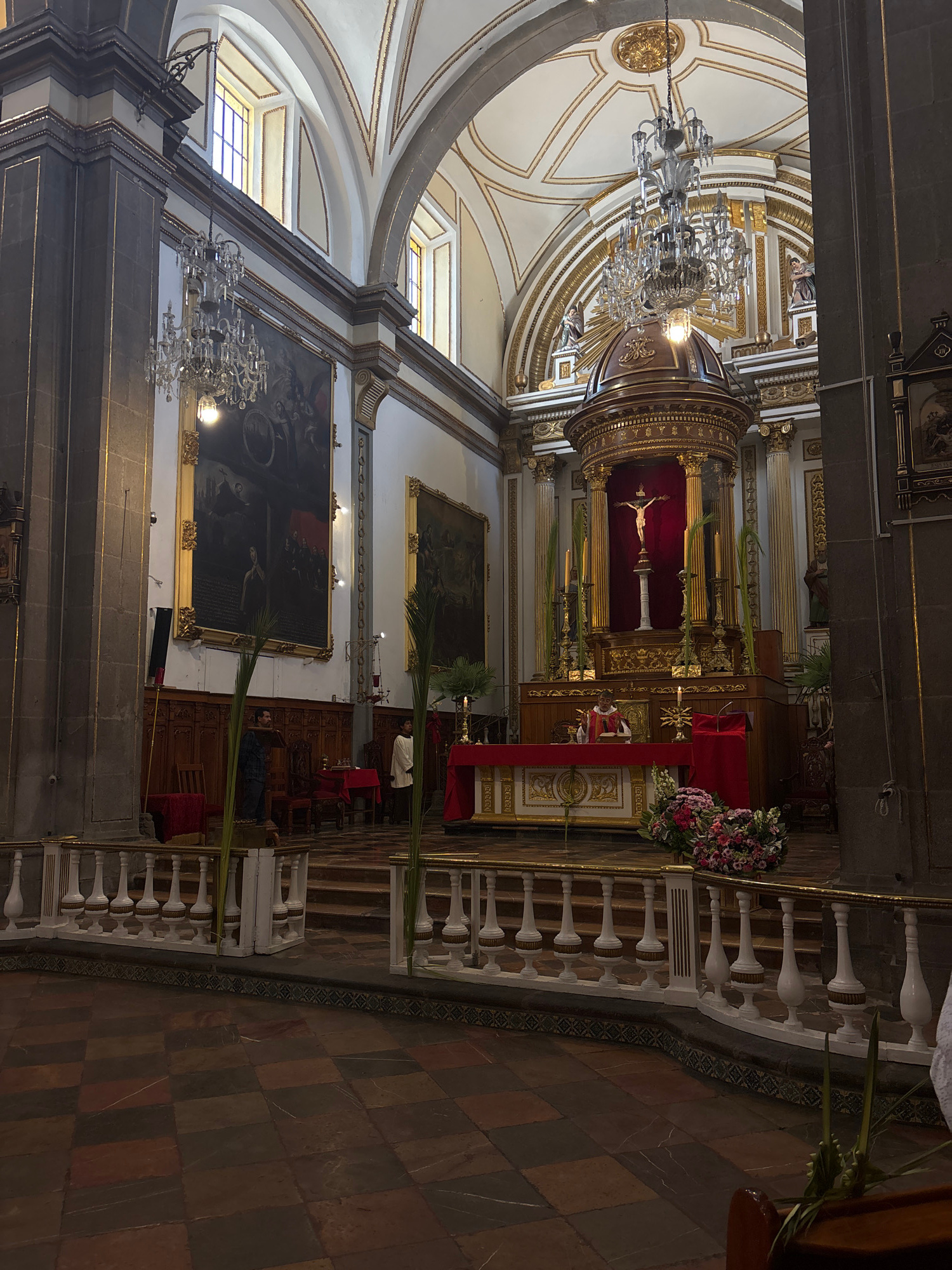 The image captures the interior of a cathedral in Puebla, Mexico. The altar features a crucifix against a red backdrop, surrounded by elaborate gold ornamentation. Crystal chandeliers hang from the va…read more