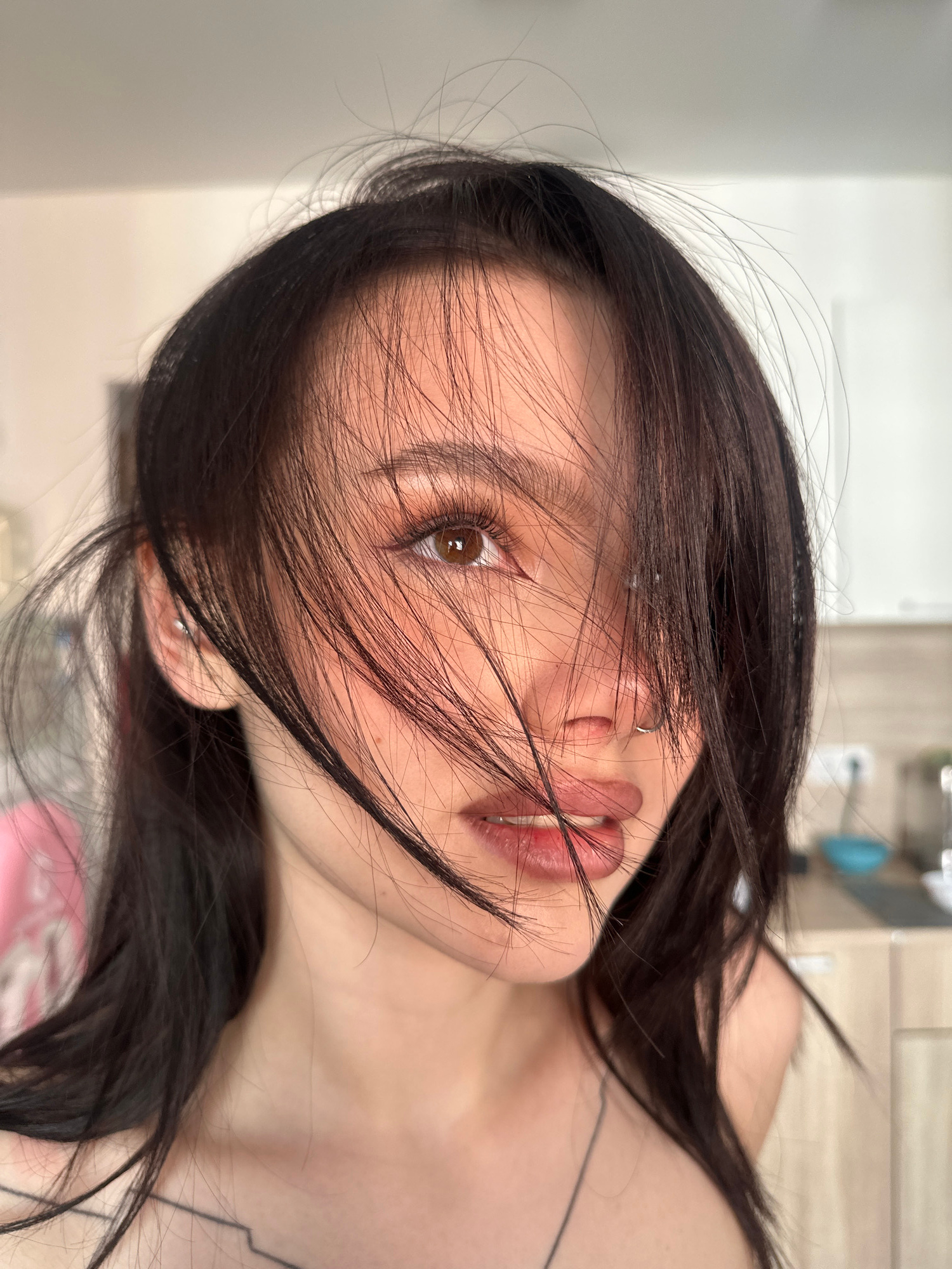 A close-up, portrait-oriented photograph depicts a young woman with dark hair partially obscuring her face. Her skin tone is fair. Her right eye, the only one fully visible, is brown. She has a septum…read more
