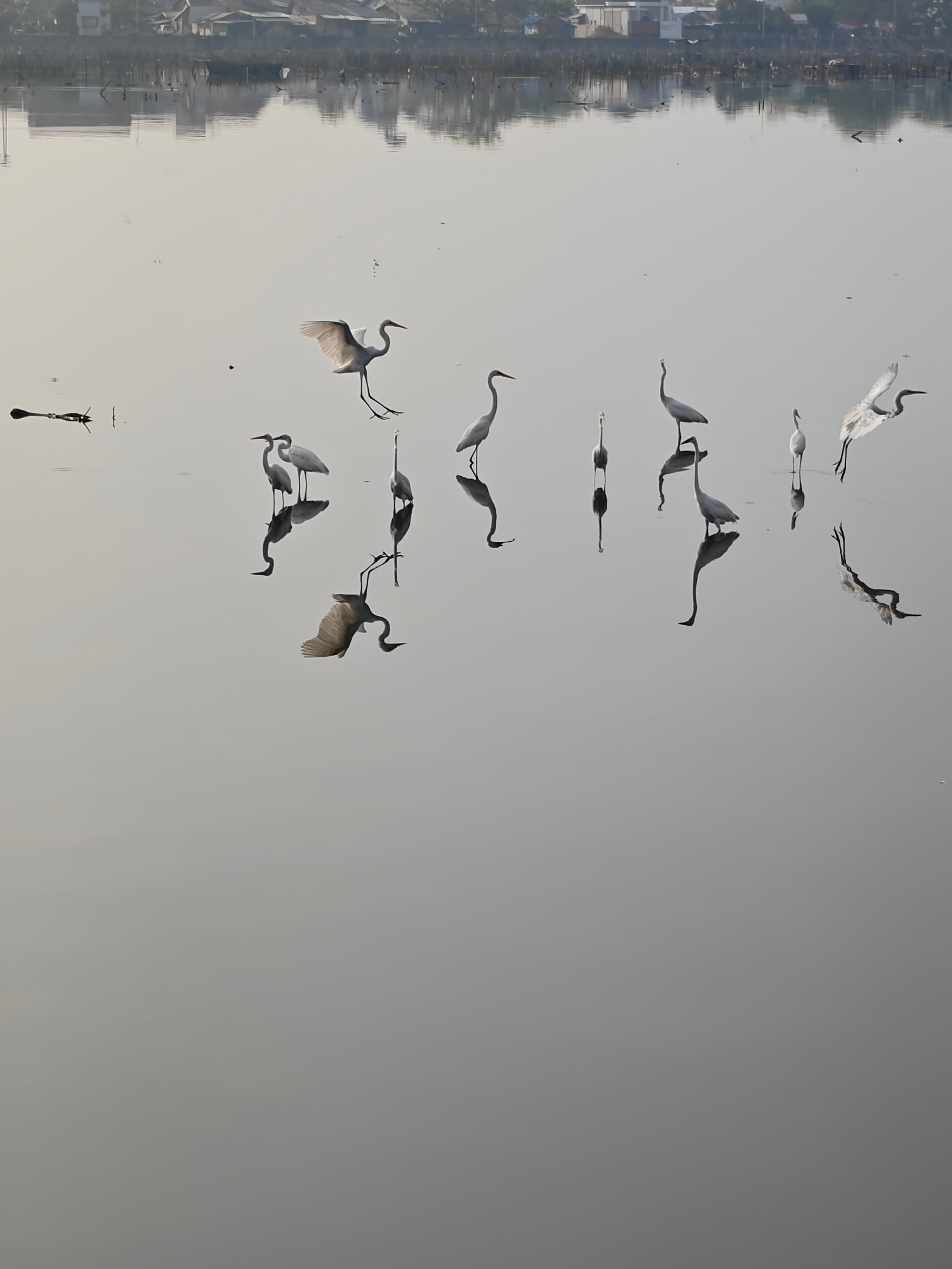The image depicts a shallow body of water reflecting a cityscape in the distance, likely in Lhokseumawe, Indonesia. In the water stand a group of white birds, possibly egrets or herons, some standing…read more