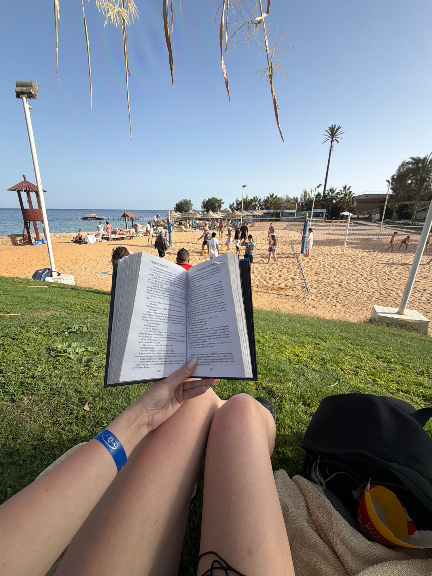 The image depicts a first-person perspective of someone sitting on grass near a sandy beach. The beach is populated with people and beach umbrellas, leading to the ocean. A person is holding an open b…read more