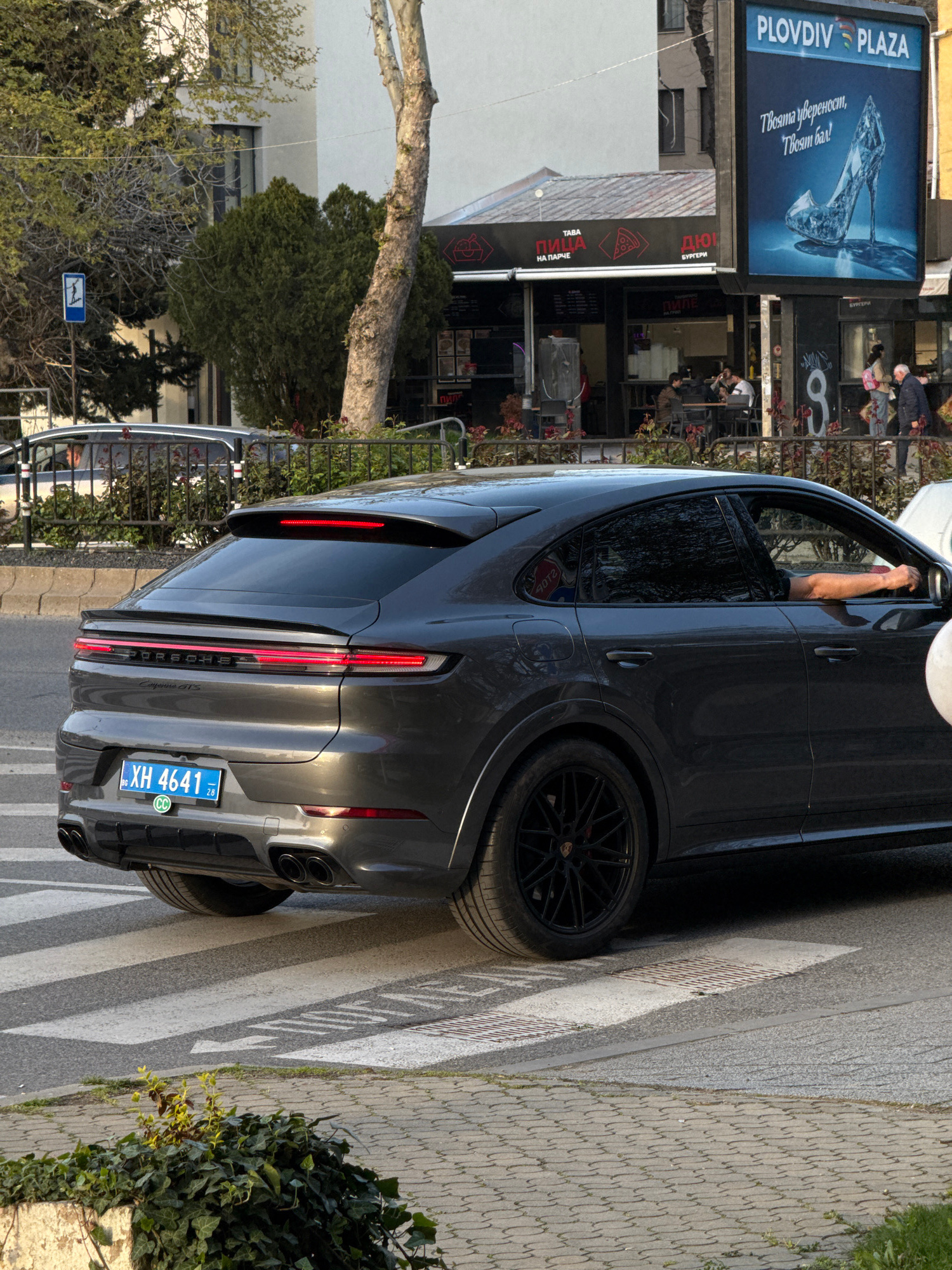 A gray Porsche Cayenne GTS is parked on a crosswalk. The license plate is "XH 4641 28" and has "BG" and "CC" printed on it. The background shows the Plovdiv Plaza sign above a restaurant. People are s…read more