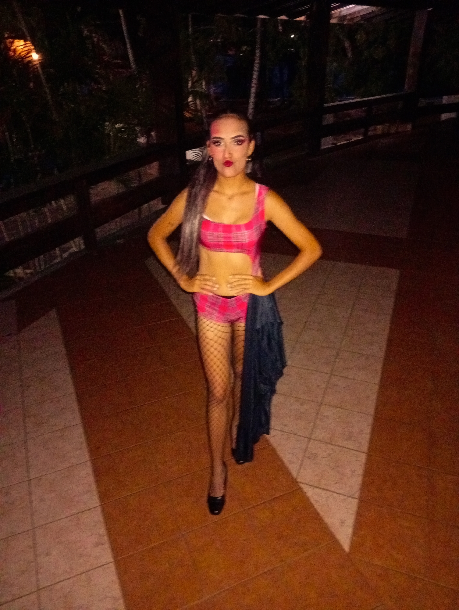 A woman stands on a tiled patio at night in Playa El Agua, Venezuela. She is wearing a pink plaid two-piece outfit, fishnet stockings, and black heels. Her hair is dyed grey, and she wears dramatic ma…read more