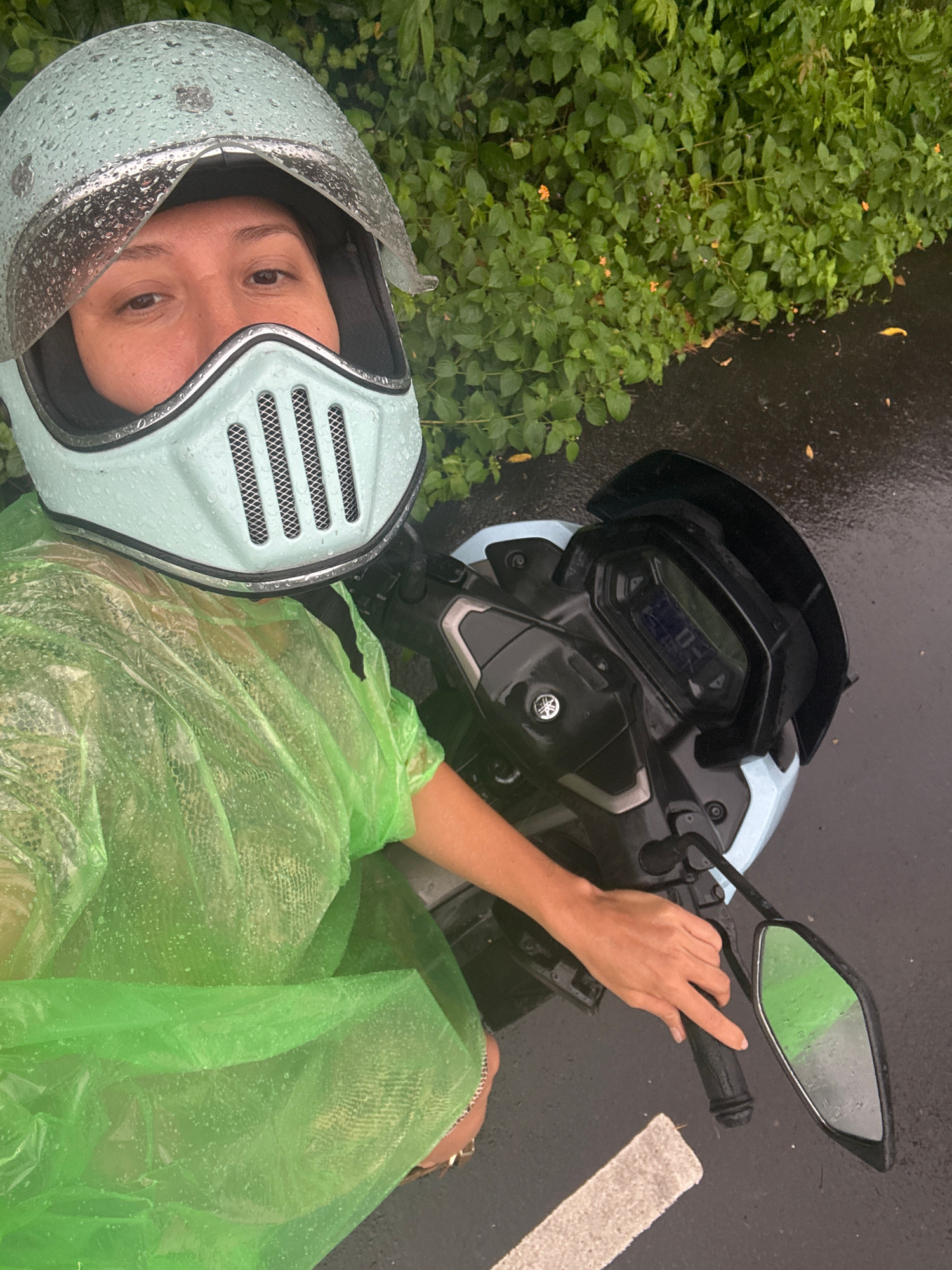 This high-angle shot captures a person on a scooter, wearing a helmet and raincoat, seemingly stopped by a roadside in Kuta Selatan, Indonesia. The primary subject is an individual, whose face is visβ¦read more