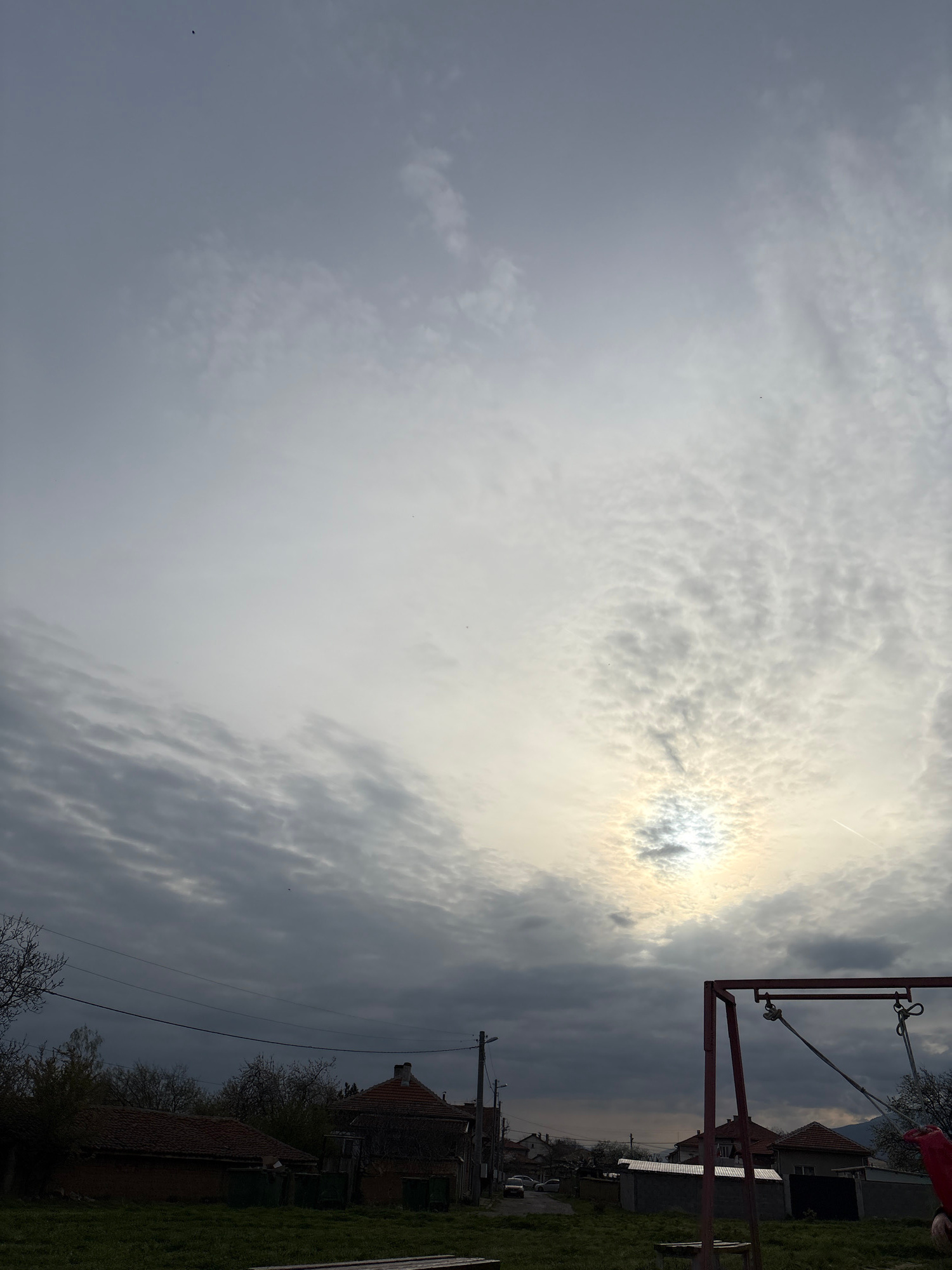 The image captures a rural or semi-rural scene under a cloudy sky. The upper portion is dominated by a vast expanse of altocumulus or stratocumulus clouds, varying in density and texture. The sun is p…read more