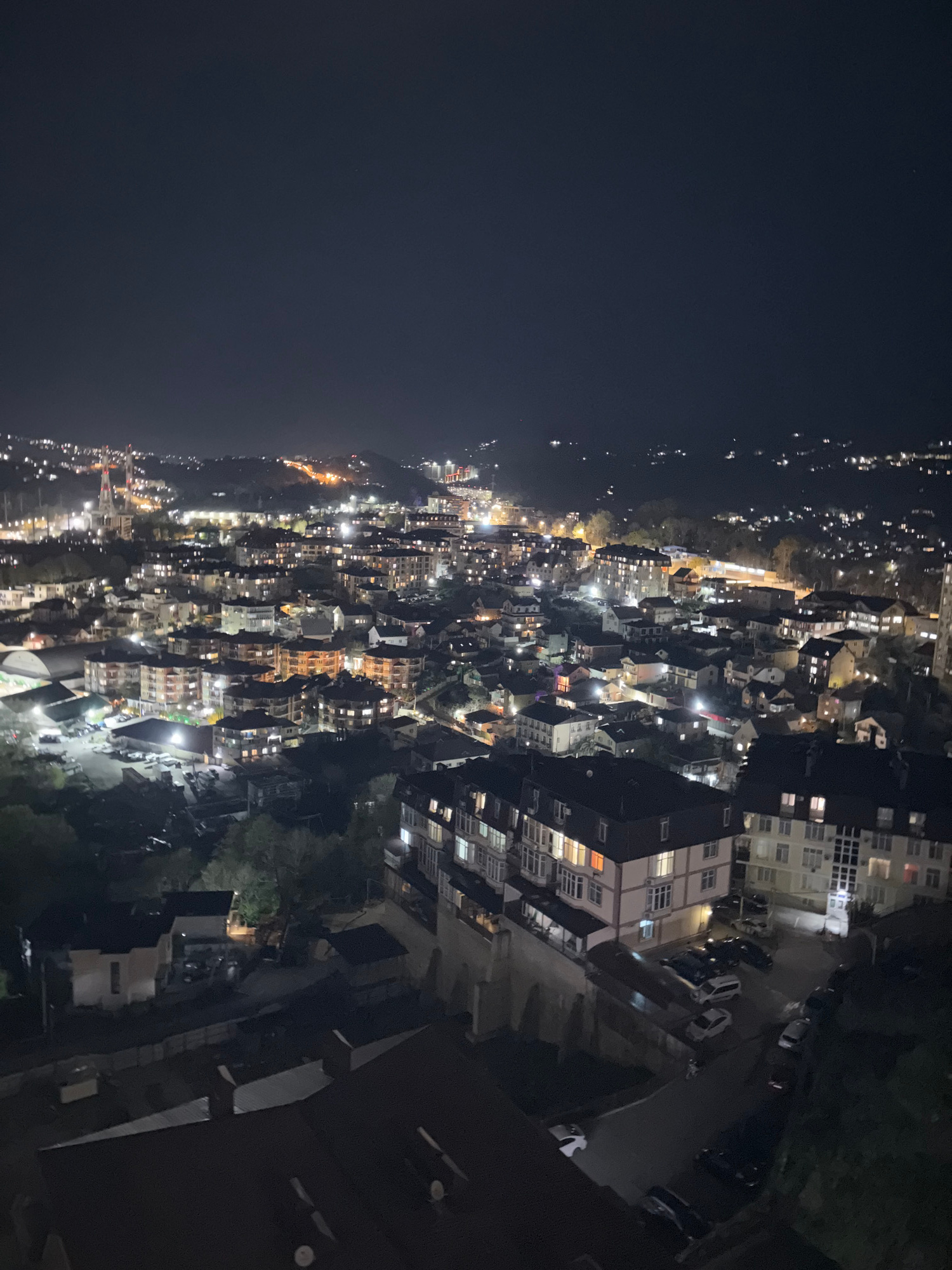 An aerial shot shows a brightly lit city at night. The city has a high density of buildings and the lights from cars and buildings create a stark contrast against the dark sky. A large dark body of wa…read more