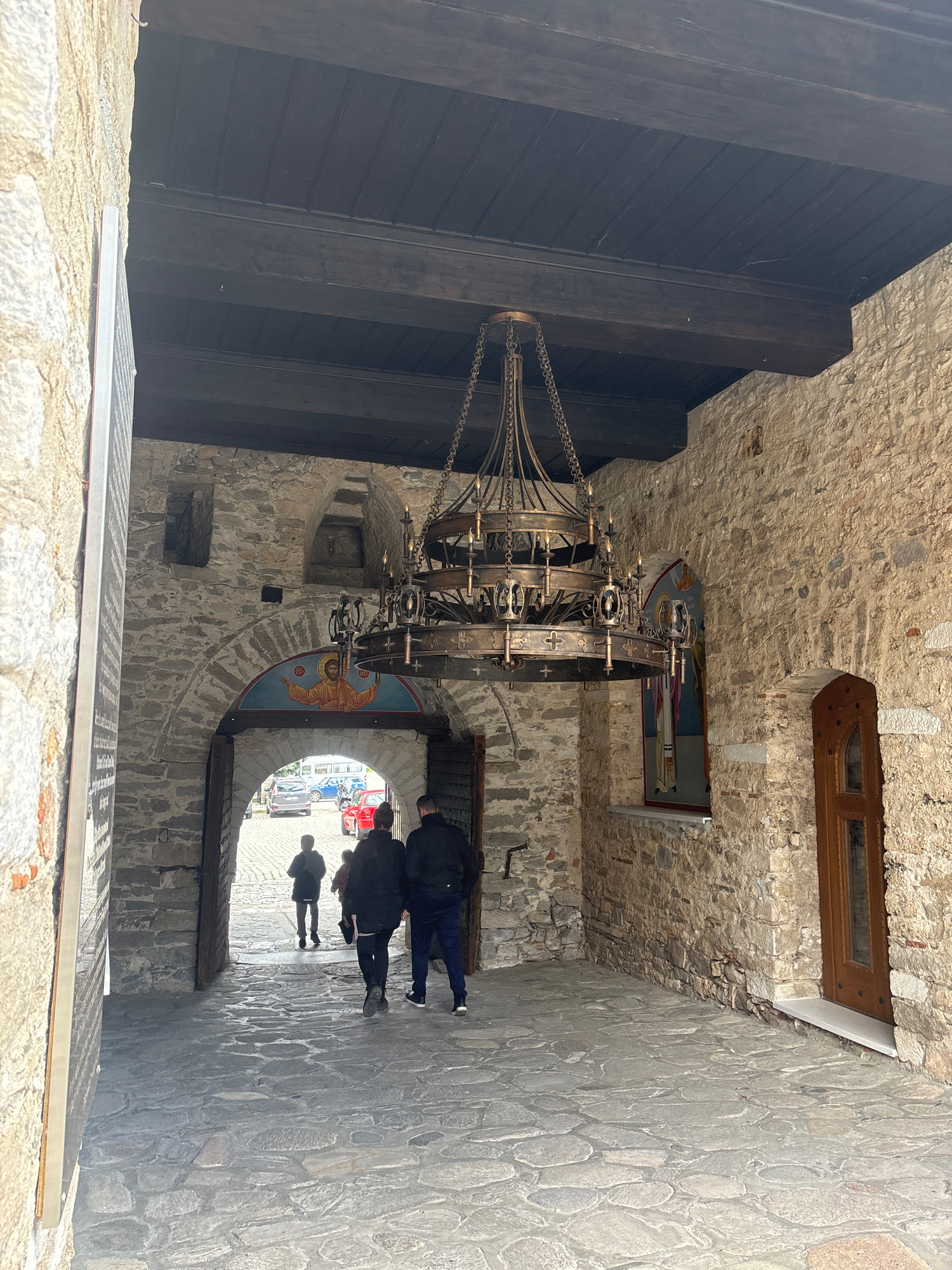 The image shows an interior view of a stone structure, likely an archway or tunnel, in what is suggested to be Bachkovo, Bulgaria. The walls are constructed of irregular stone blocks. A metal chandeli…read more