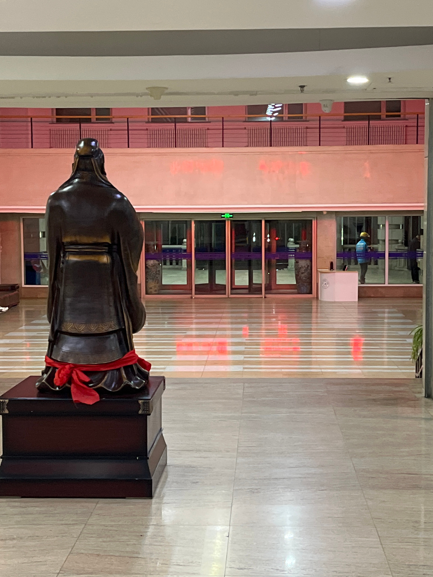 A bronze-colored statue, draped with a red ribbon, sits atop a multi-tiered dark wooden base. The statue and base are located on a light tan-colored tiled floor. The background features a multi-story…read more