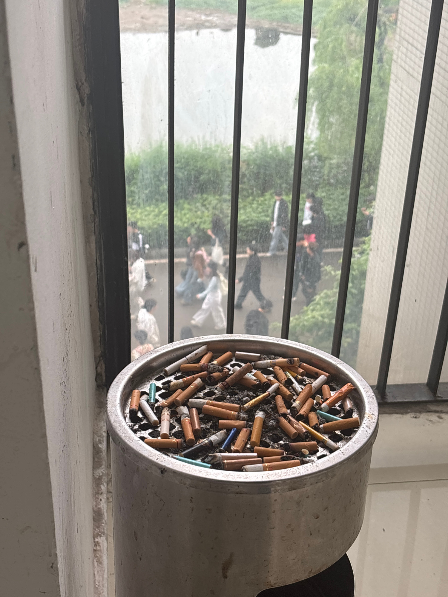 An eye-level, indoor shot shows a metal ashtray filled with cigarette butts and ash positioned on a white windowsill, against a black-framed window with horizontal metal bars. Reflected through the wi…read more