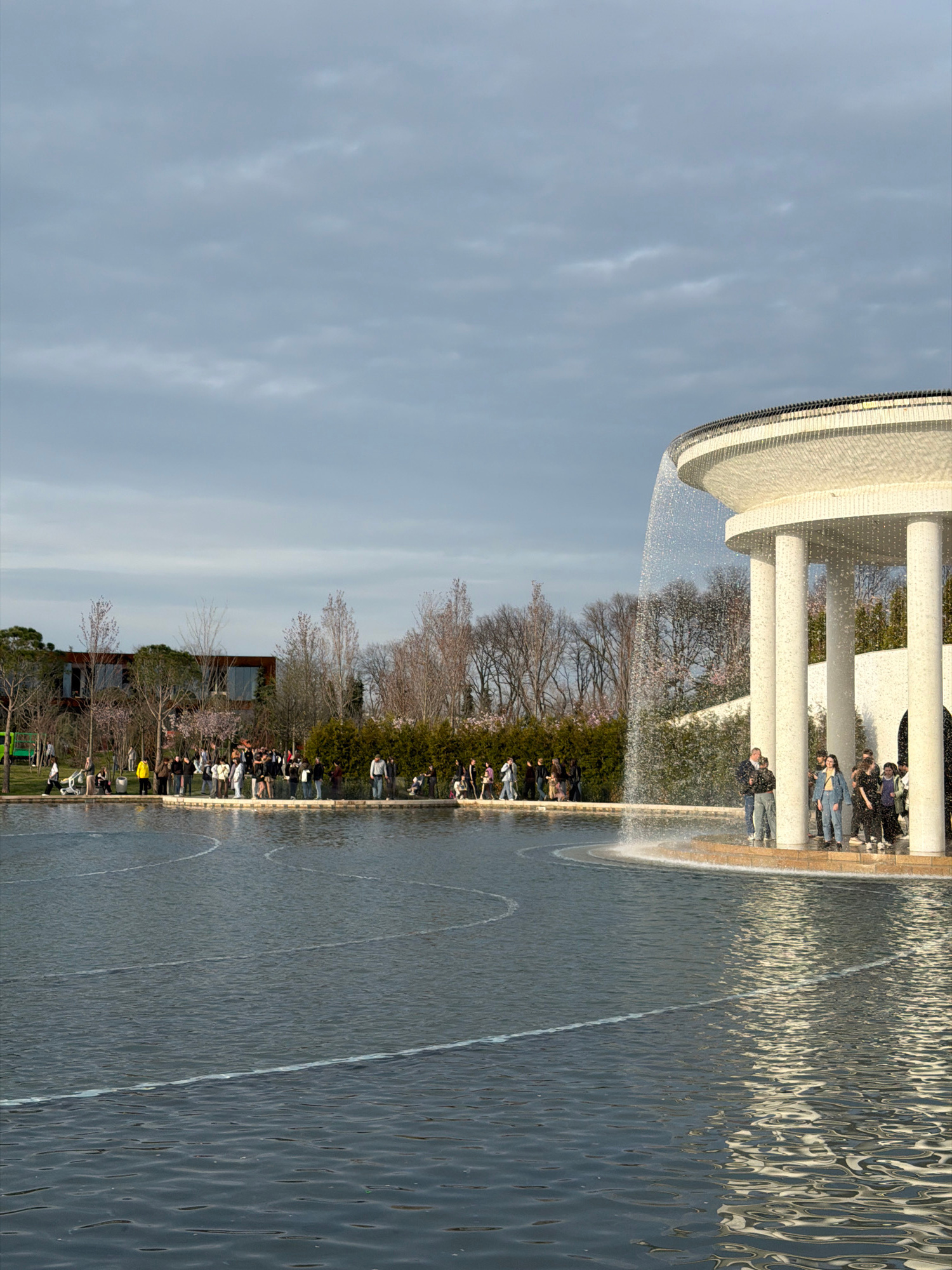 The image shows a public fountain with a curved architectural structure in Krasnodar, Russia. The fountain features a ring of water cascading down into a pool. People are seen sitting and standing aro…read more