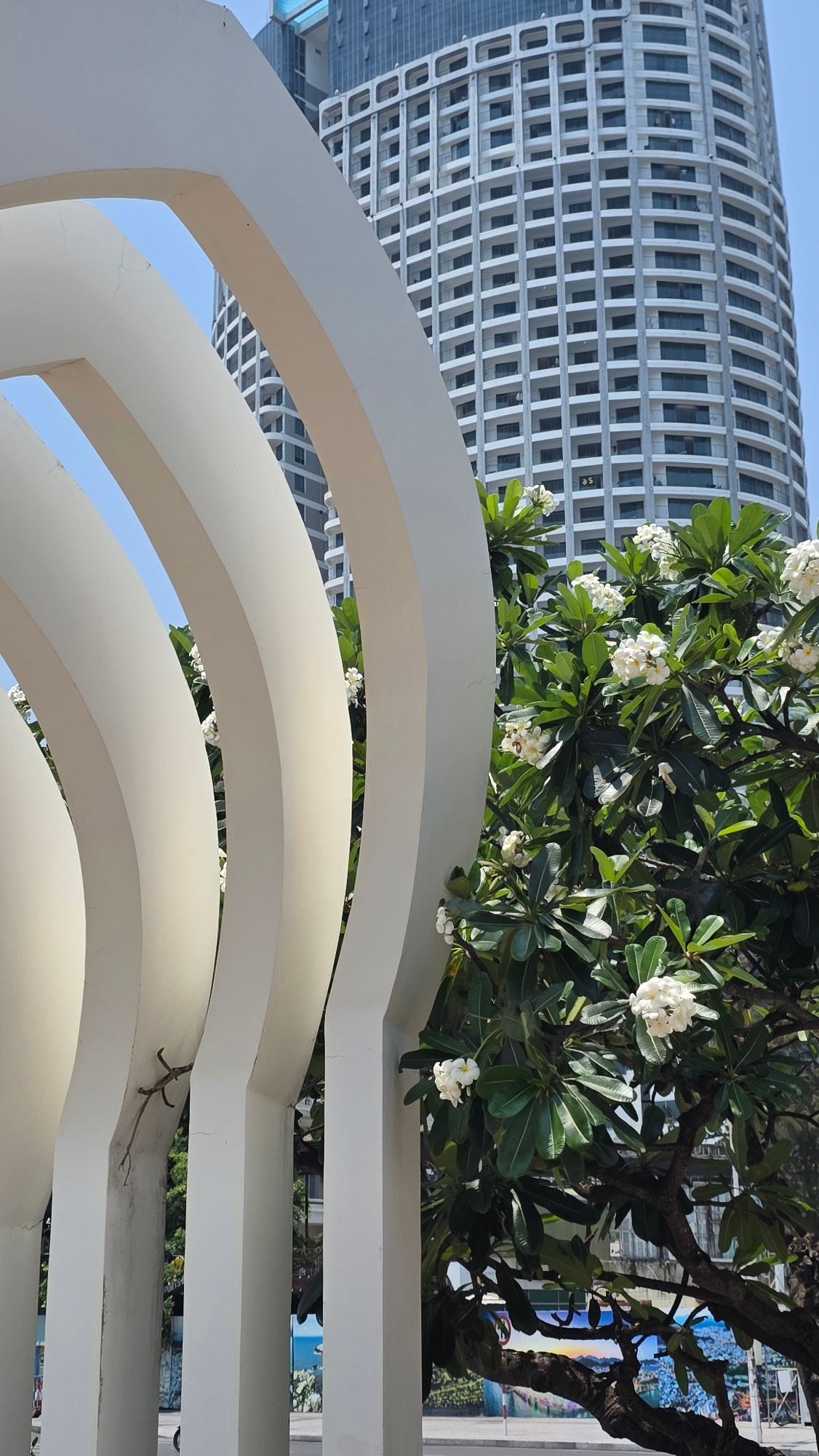 The image shows a view in Nha Trang, Vietnam. In the foreground are white, curved architectural elements, possibly part of a public structure or art installation. Through the arches of these elements,…read more