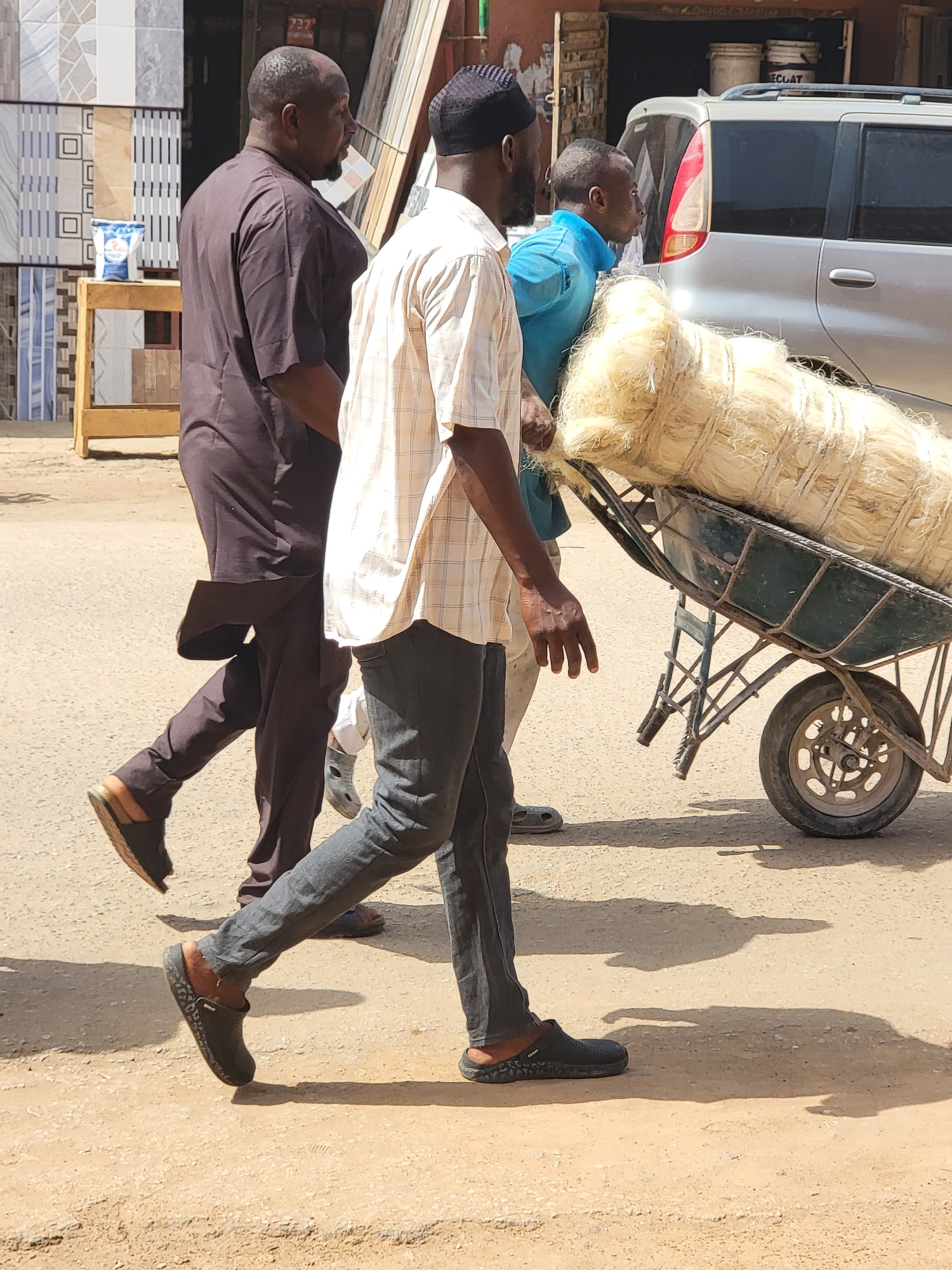 The image depicts a sunny outdoor street scene in Maiburiji, Nigeria, likely during the morning or late afternoon due to the strong, elongated shadows cast on the light-colored paved or dirt ground.…read more