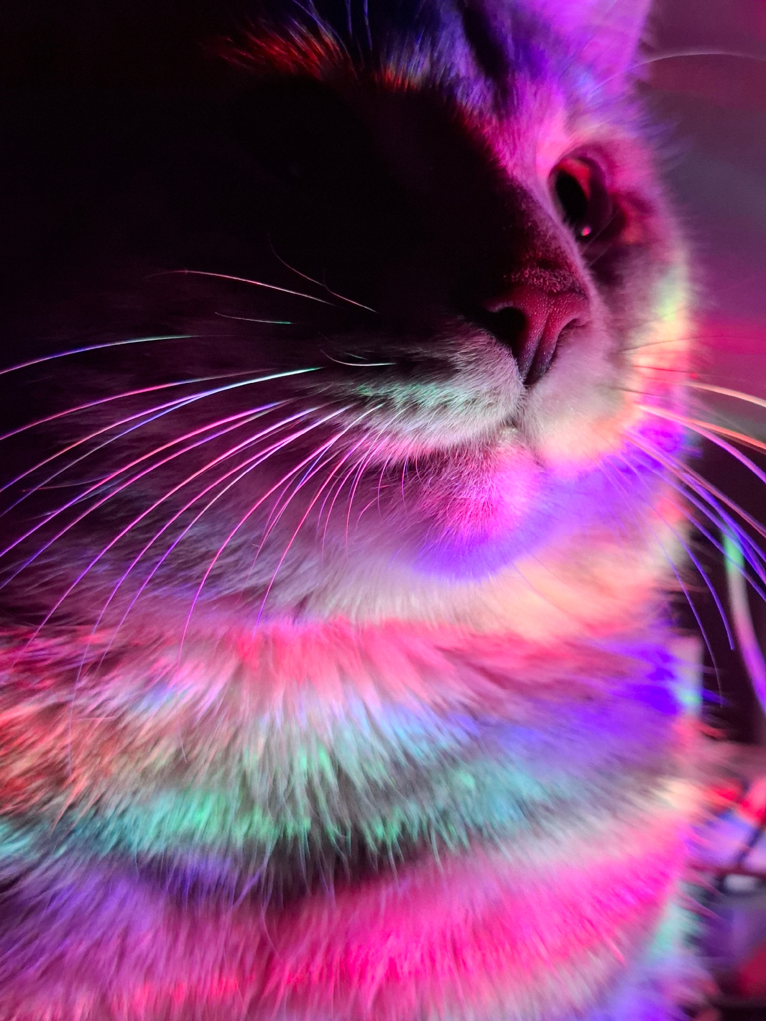 A close-up image depicts a cat lying on its back. The cat's face is the central focus, with its nose prominent and its eye partially visible. The cat's fur is illuminated by bright, multicolored light…read more