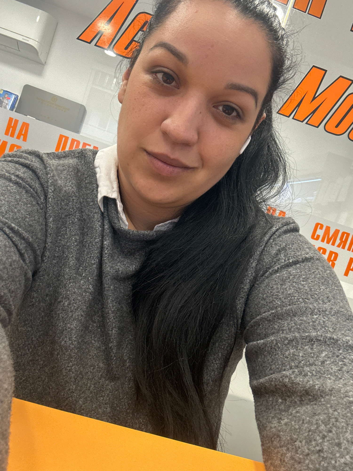A medium close-up selfie of a woman with dark hair and brown eyes. She wears a gray wool sweater with a white collared shirt underneath. An earbud is visible in her left ear. The photo is taken indoor…read more
