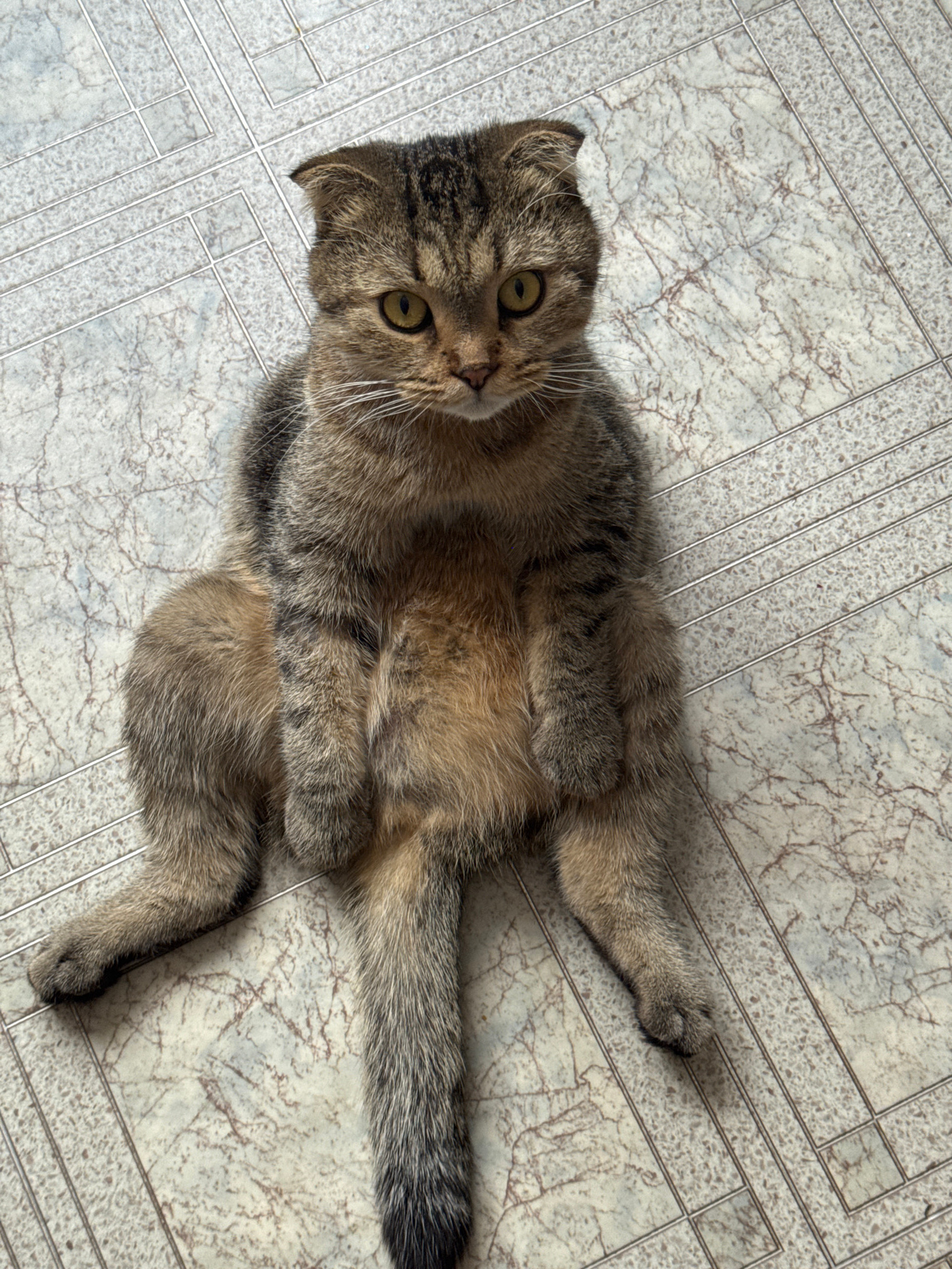 A domestic cat, likely a Scottish Fold due to its folded ears, is depicted lying on its back on a tiled floor in an indoor setting in Chaikovsky, Russia. The cat has a tabby coat, featuring stripes an…read more