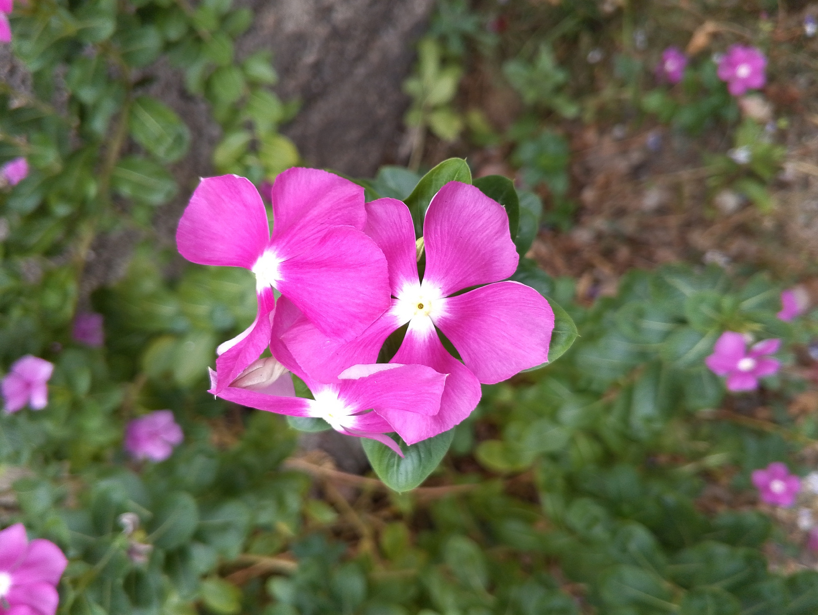 The image shows a cluster of pink periwinkle flowers in bloom. The flowers are the focal point, with vibrant petals and white centers. They are surrounded by green leaves and other periwinkle plants.…read more