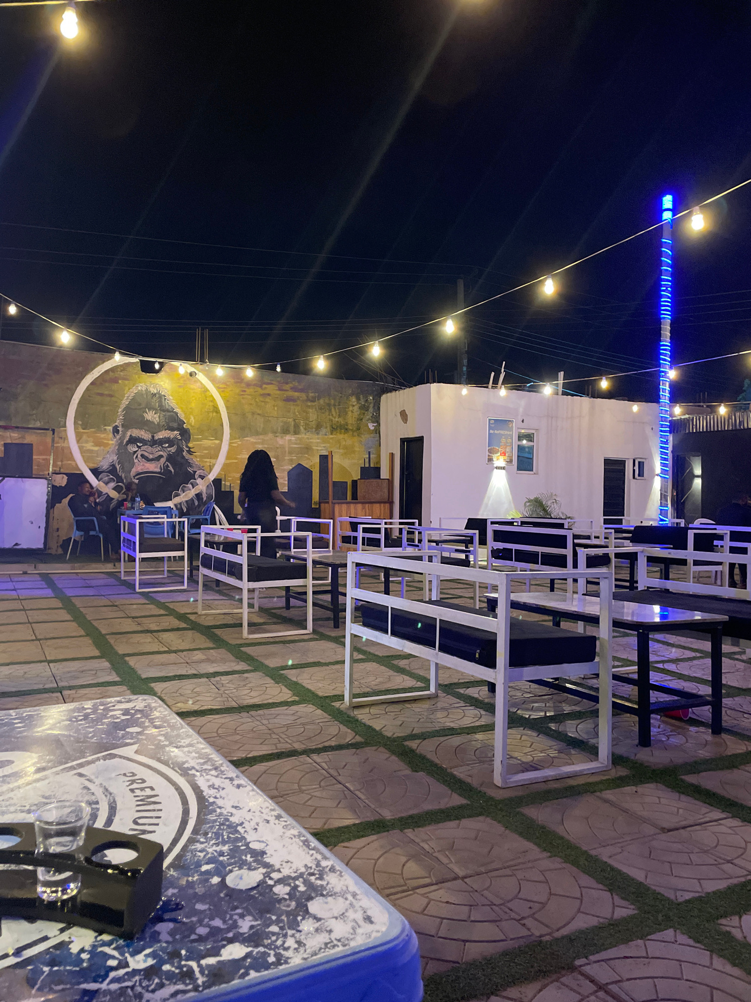 This is an outdoor scene at night, likely in a commercial area of Jos, Nigeria. Several rows of white metal chairs and black tables are arranged on a tiled surface with artificial turf in the seams. A…read more