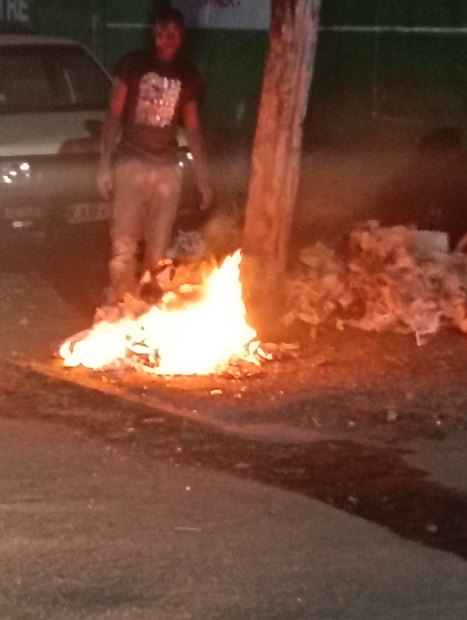 The image depicts a fire burning on a paved surface in what appears to be an urban setting. Next to the fire, there is a pile of trash and a tree trunk. A dark-skinned person wearing a t-shirt and lig…read more